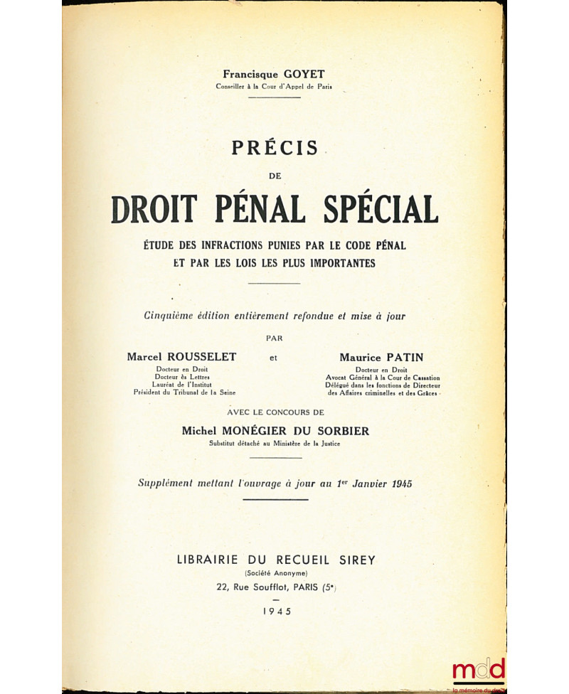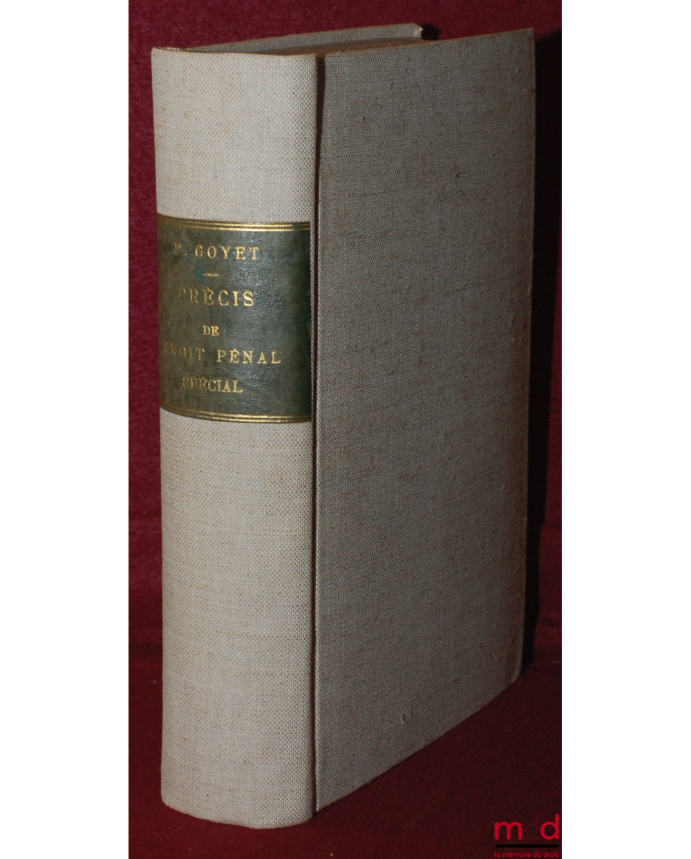 Malgré sa date d’édition apparente (1945), ce volume reproduit en réalité la quatrième édition du classique Précis de droit pénal spécial de Goyet paru en 1941. La mise à jour pour la période postérieure à la Guerre n’est assurée que par un fascicule joint à la fin de l’ouvrage. Il est par conséquent tout à fait intéressant dans la mesure où il montre l’évolution du droit pénal pendant les années 30 et au début des années 40 dans cette matière très spécifique qui contient notamment l’ensemble des crimes et délits contre la sûreté de l’État, contre la Constitution et la paix publique, contre les personnes, contre les destructions et prédations. Il permet de constater que le durcissement du droit pénal n’est pas l’apanage du régime de l’État français mais a déjà largement commencé à la fin de la IIIème République.