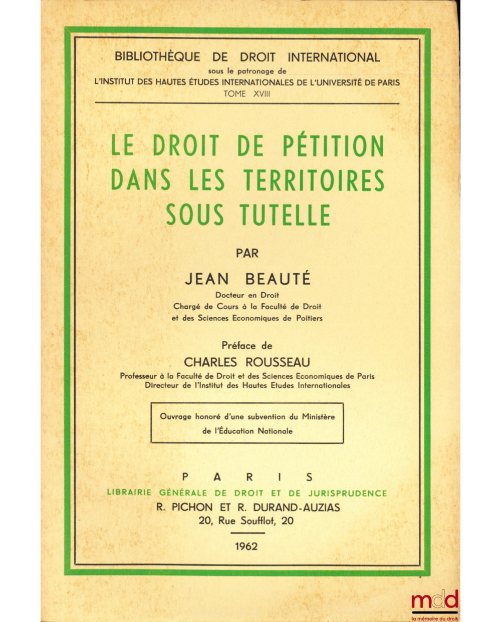 LE DROIT DE PÉTITION DANS LES TERRITOIRES SOUS TUTELLE, Préface de Charles Rousseau, Bibl. de droit intern., t. XVIII