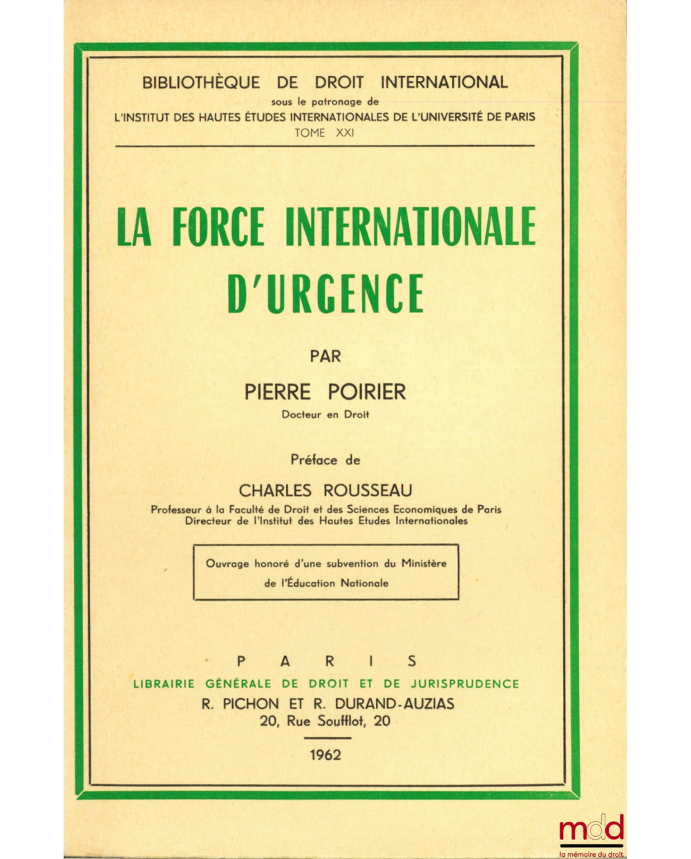 LA FORCE INTERNATIONALE D’URGENCE, Préface de Charles Rousseau, Bibl. de droit intern., t. XXI