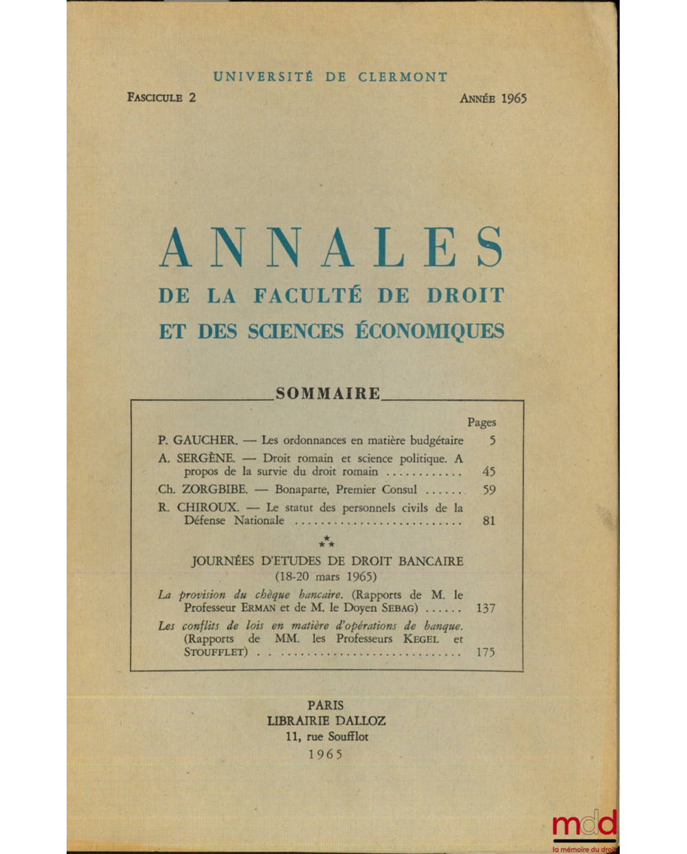 Troisième livraison des Annales de Clermont avec les contributions de P. Gaucher, Le ordonnances en matière budgétaire ; A. Sergène, Droit romain et science politique. A propos de la survie du droit romain ; Ch. Zorgbibe, Bonaparte Premier Consul ; R. Chiroux, Le statut des personnels civils à la Défense Nationale ; La provision du chèque bancaire (rapport de MM. Erman et Sebag) ; Les conflits de lois en matière d’opération de banque (Rapport de MM. Kegel et Stoufflet).