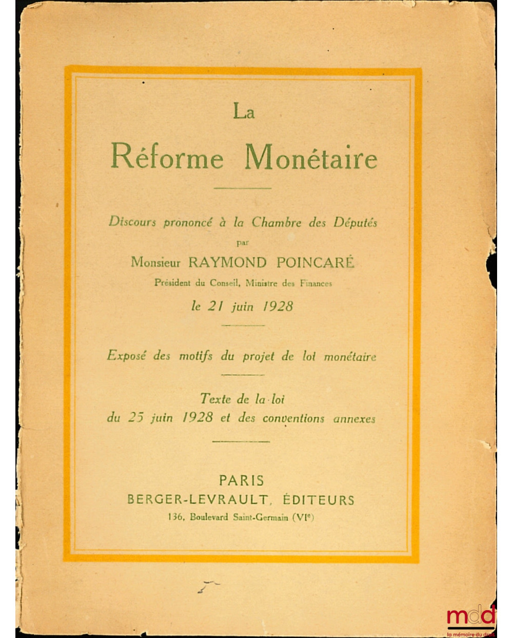 LA RÉFORME MONÉTAIRE. Exposé des motifs du projet de loi monétaire (Texte de la loi du 25 juin 1928 et des conventions annexes). Discours prononcé à la Chambre des Députés le 21 juin 1928
