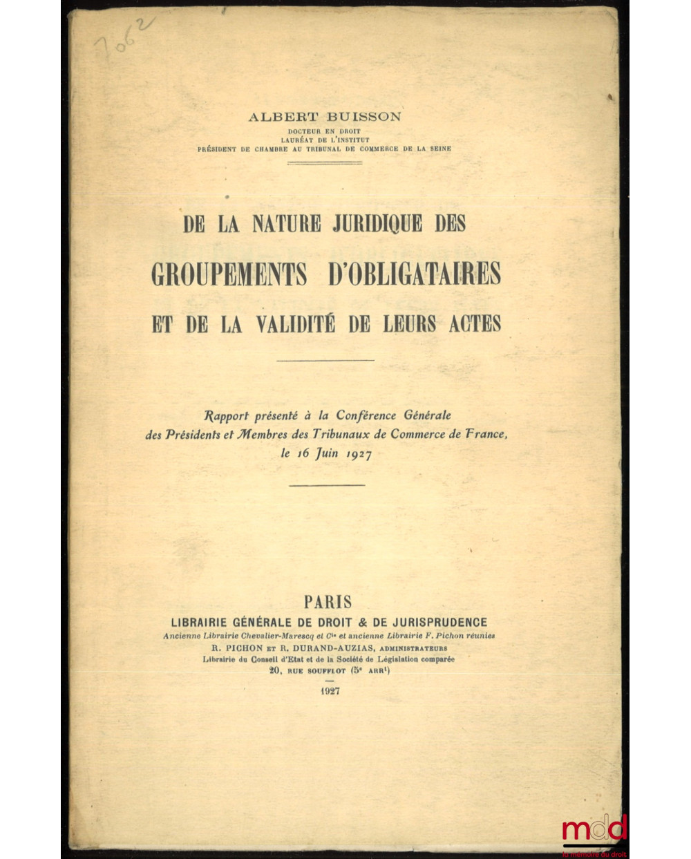 DE LA NATURE JURIDIQUE DES GROUPEMENTS D’OBLIGATAIRES ET DE LA VALIDITÉ DE LEURS ACTES, Rapport présenté à la Conférence Générale des Présidents et Membres des Tribunaux de Commerce de France, le 16 juin 1927