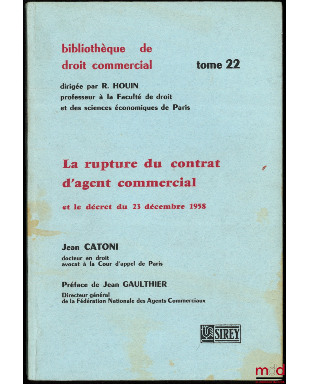 LA RUPTURE DU CONTRAT D’AGENT COMMERCIAL et le décret du 23 décembre 1958, Préface de Jean Gaulthier, Bibl. de droit commercial, t. 22