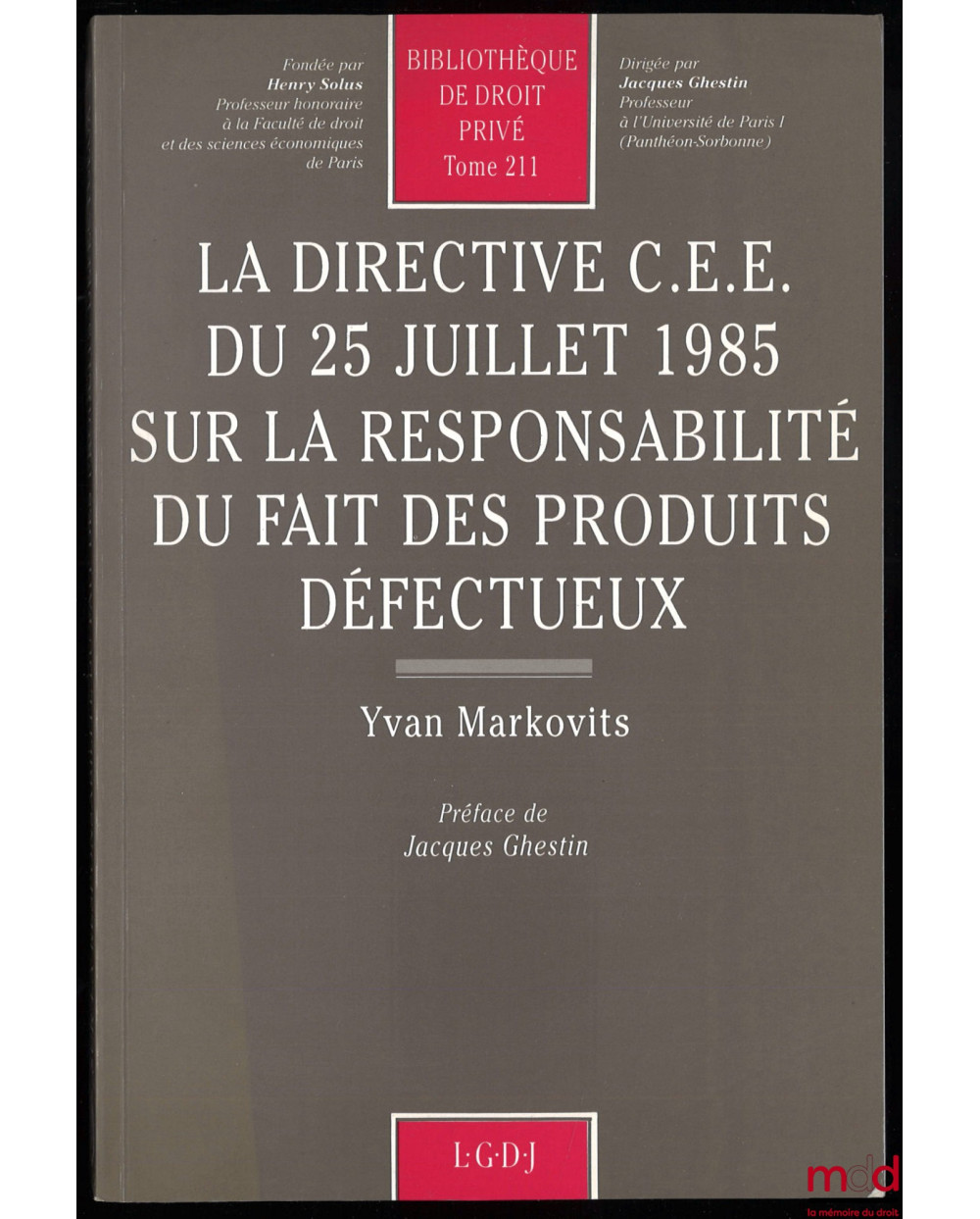 LA DIRECTIVE C.E.E. DU 25 JUILLET 1985 SUR LA RESPONSABILITÉ DU FAIT DES PRODUITS DÉFECTUEUX, Préface de Jacques Ghestin, Bibl. de droit privé, t. 211