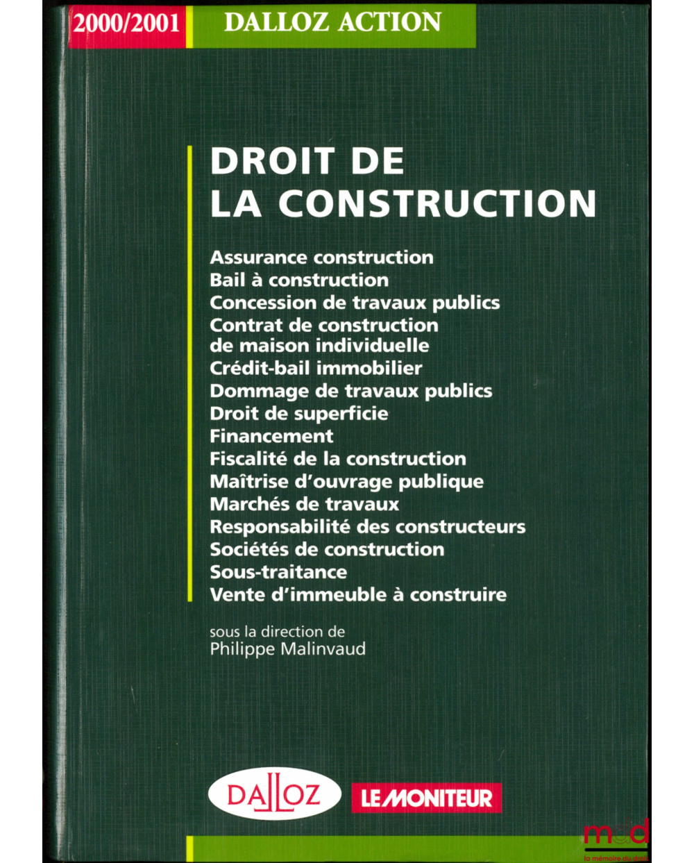 DROIT DE LA CONSTRUCTION. Assurance construction - Bail à construction - Concession de travaux publics - Contrat de construction de maison individuelle - Crédit-bail immobilier - Dommages de travaux-publics - Droit de superficie - Financement - Fiscalité de la construction - Maîtrise d’ouvrage publique - Marchés de travaux - Responsabilité des constructeurs - Sociétés de construction - Sous-traitance - Vente d’immeuble à construire. Coll. Dalloz Action