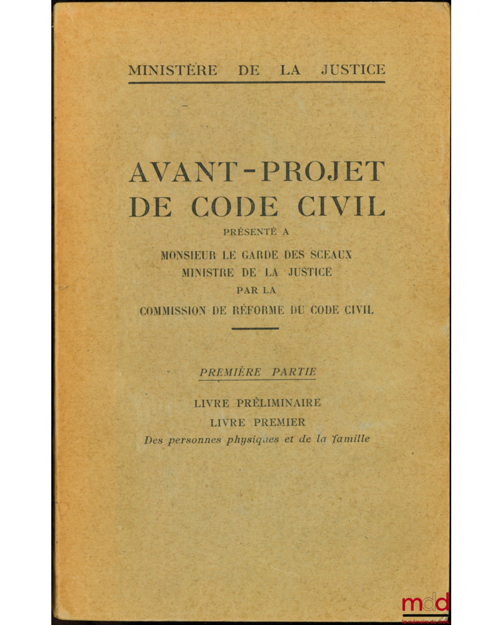 AVANT-PROJET DE CODE CIVIL présenté à Monsieur Le Garde des Sceaux, Ministre de la Justice, par la Commission de réforme du Code civil, PREMIÈRE PARTIE : LIVRE PRÉLIMINAIRE, LIVRE PREMIER : Des personnes physiques et de la famille, Rapport préliminaire par Léon Julliot de la Morandière, (t. 1 seul)