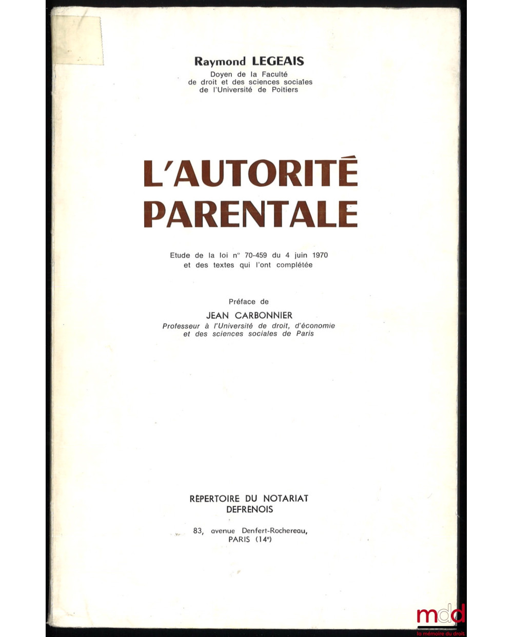 L’AUTORITÉ PARENTALE, Étude de la loi n° 70-459 du 4 juin 1970 et des textes qui l’ont complétée, Préface de Jean Carbonnier