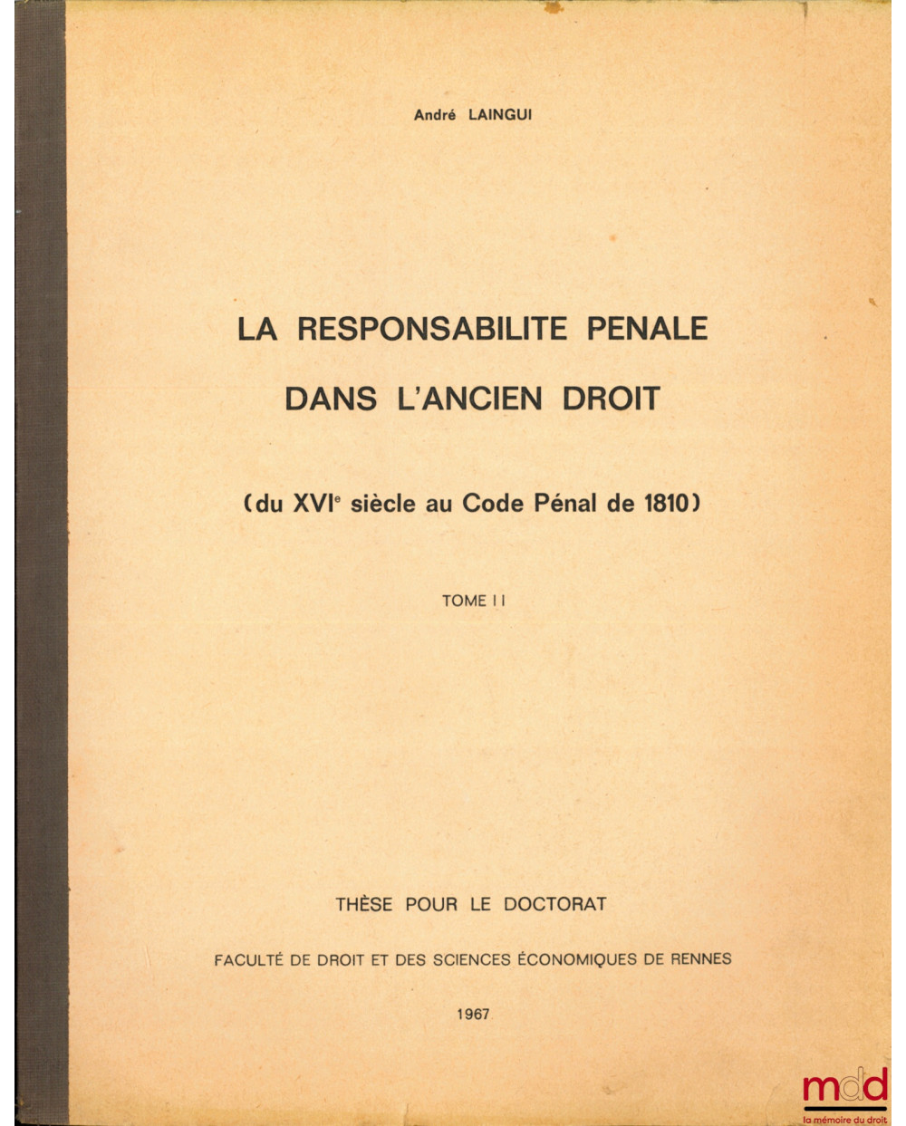 LA RESPONSABILITÉ PÉNALE DANS L’ANCIEN DROIT (du XVIe au Code Pénal de 1840), t. II uniquement, Faculté de droit et des sciences économique de Rennes