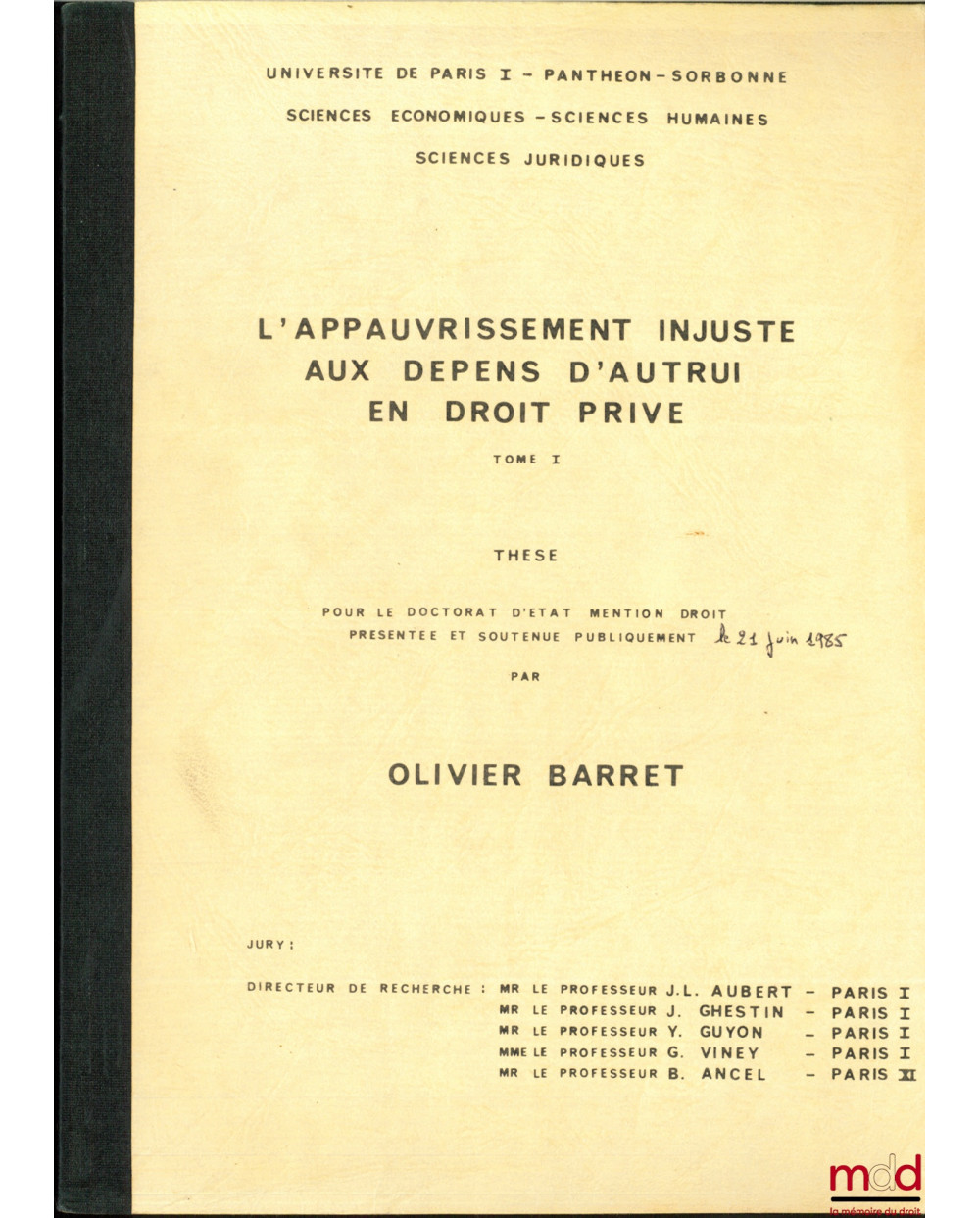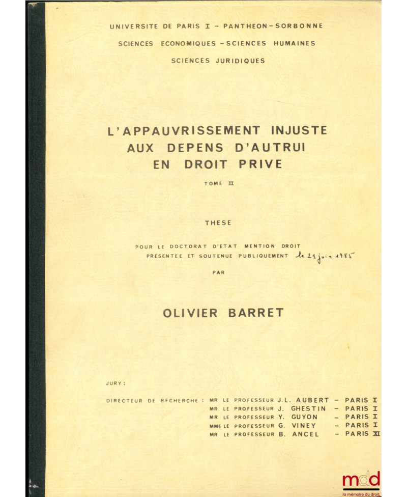 L’APPAUVRISSEMENT INJUSTE AUX DÉPENS D’AUTRUI EN DROIT PRIVÉ, thèse [non publiée] pour le Doctorat d’État mention Droit, présentée et soutenue le 21 juin 1985 présidée par Jean-Louis Aubert, Université de Paris I - Panthéon - Sorbonne