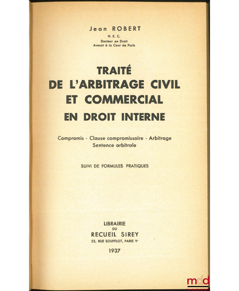TRAITÉ DE L’ARBITRAGE CIVIL ET COMMERCIAL EN DROIT INTERNE, Compromis, Clause compromissoire, Arbitrage, Sentence arbitrale suivi de formules pratiques