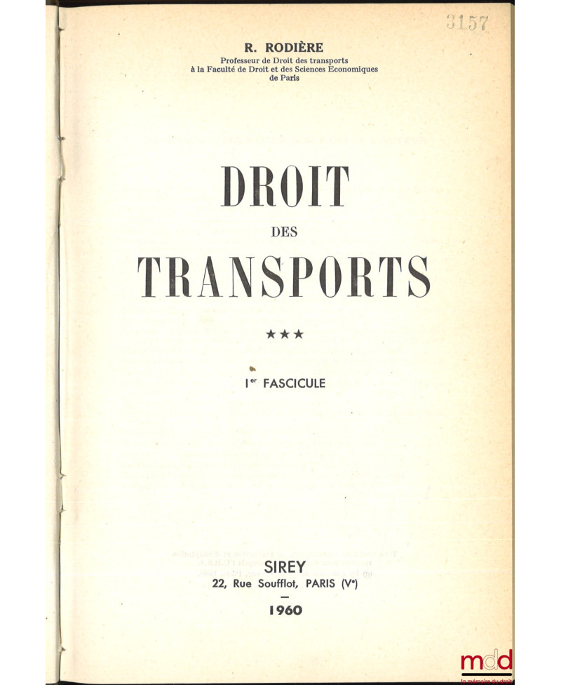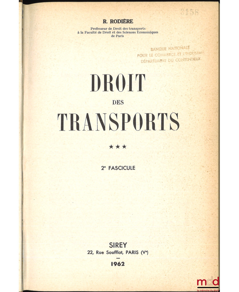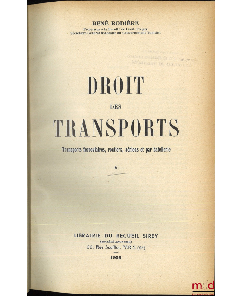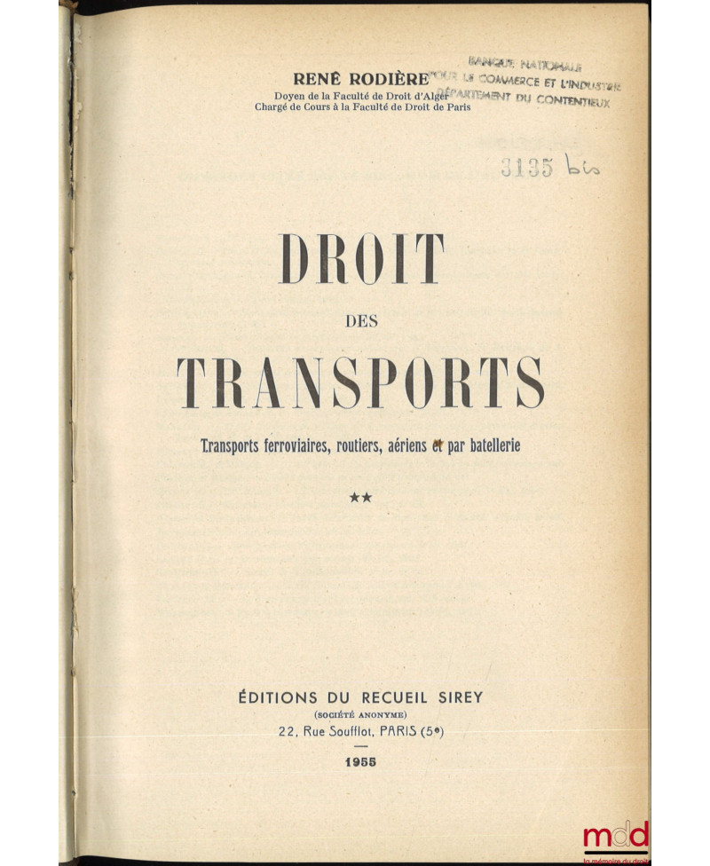 L’auteur a été le plus grand spécialiste du droit des transports, nous avons ici la première édition de ce traité (qui inclut les transports maritimes). Il en publiera une seconde en 1977 avant d’en faire un Précis Dalloz. Ce texte fondamental est devenu rare.