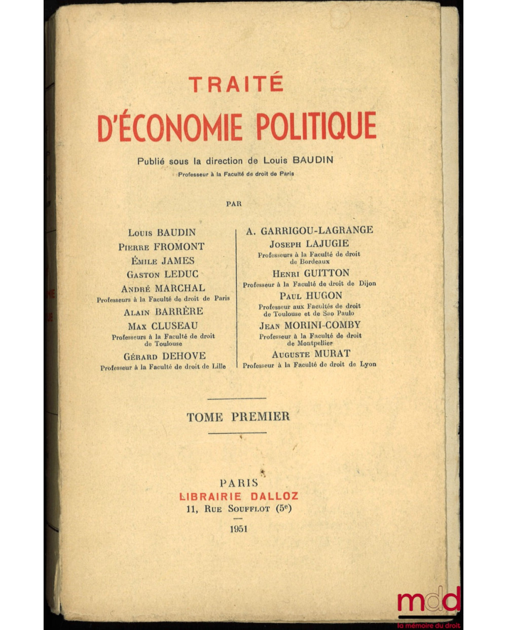 TRAITÉ D’ÉCONOMIE POLITIQUE, tome I (1ère éd.), publié sous la direction de Louis BAUDIN