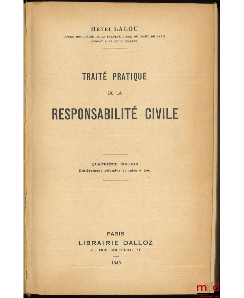 Traité entièrement consacré à la responsabilité civile extrêmement méthodique et très complet. On peut noter une partie très substantielle sur la responsabilité des personnes publiques devant le juge judiciaire. Il donne un aperçu extrêmement complet de la jurisprudence dans cette matière généralement peu connue des publicistes.