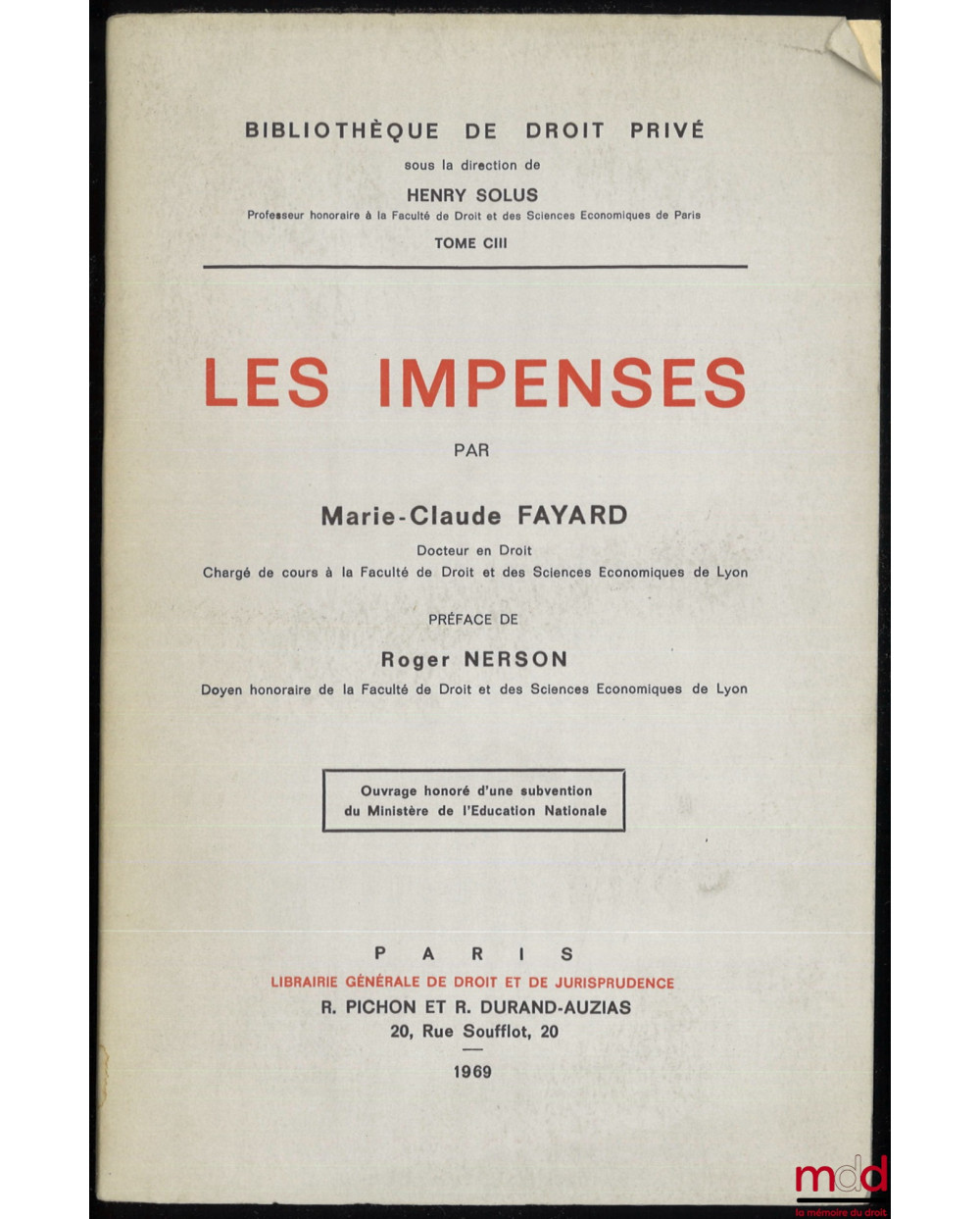 LES IMPENSES, Préface de Roger Nerson, Bibl. de droit privé, t. CIII