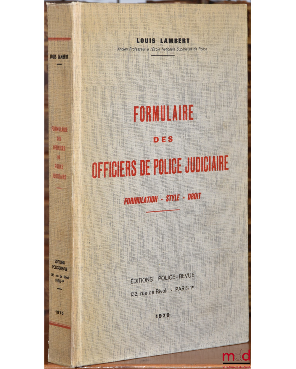 Première édition. Cet ouvrage a été conçu pour offrir « aux praticiens beaucoup plus de formules et de précisions qu’il ne convenait d’en fournir aux candidats officiers de police pour les seuls besoins de leur procédure d’examen », en prenant en compte les apports du « nouveau » code de procédure pénale entré en application le 2 mars 1959. Le lecteur y trouvera des formulations « applicables en toute rigueur telles quelles – ponctuation comprise – aux procédures du métier ainsi qu’à celle du concours, même si « hormis certaines ressemblances obligatoires d’aspect extérieur ou de terminologie, [ces] formules s’écartent considérablement, par leur structure, leur style, leur rythme, leur ton, de celles dont on use quotidiennement et qui sont de toute évidence moins bonnes. […] Ce Formulaire est donc original, et il l’est par son degré de conformité même, non aux routines existantes, plus ou moins vicieuses, plus ou moins entachées d’aberrations, de fantaisie, d’amateurisme persistant sous l’ancienneté de service, mais aux vraies règles du style procédural, et, plus spécifiquement encore, du style policier », estime l’auteur dans son avant-propos.