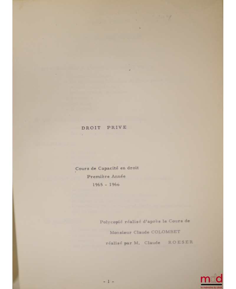 COURS DE DROIT PRIVÉ, Capacité en droit, 1re année, 1965-1966