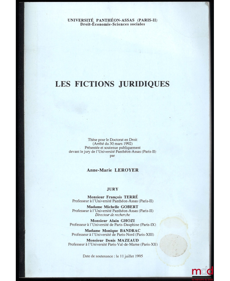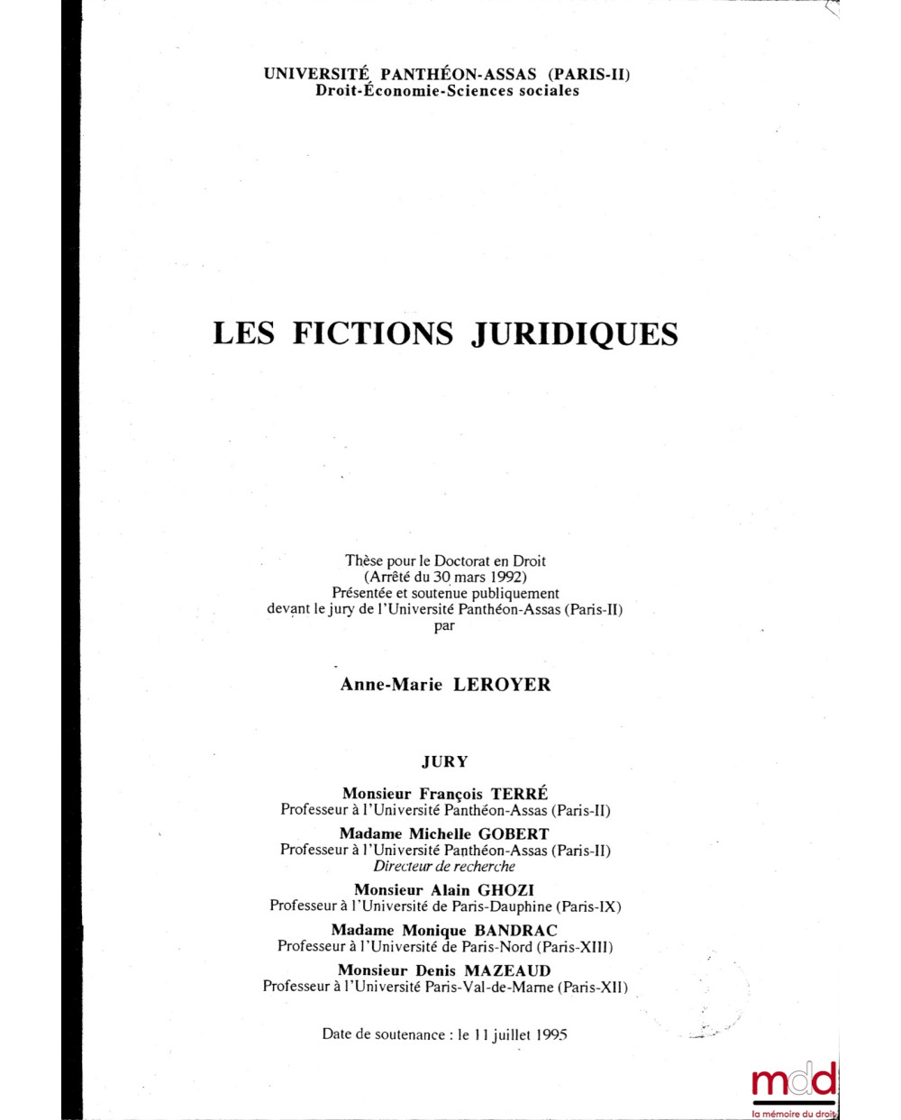 LES FICTIONS JURIDIQUES, Thèse, sous la direction de Michelle Gobert, soutenue le 11 juillet 1995