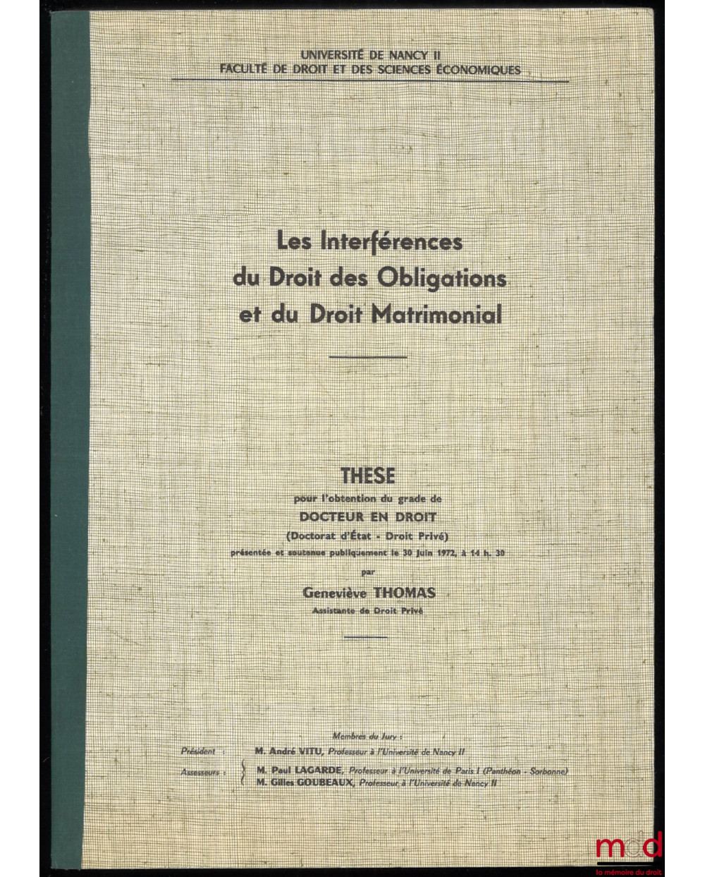 LES INTERFÉRENCES DU DROIT DES OBLIGATIONS ET DU DROIT MATRIMONIAL, Thèse pour l’obtention du grade de Docteur en Droit présentée et soutenue publiquement le 30 Juin 1972, Université de Nancy II, (Président : André Vitu, Suffragants : Paul Lagarde et Gilles Goubeaux)