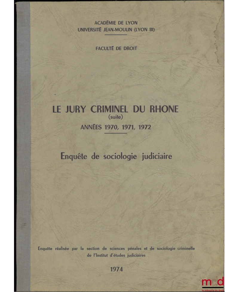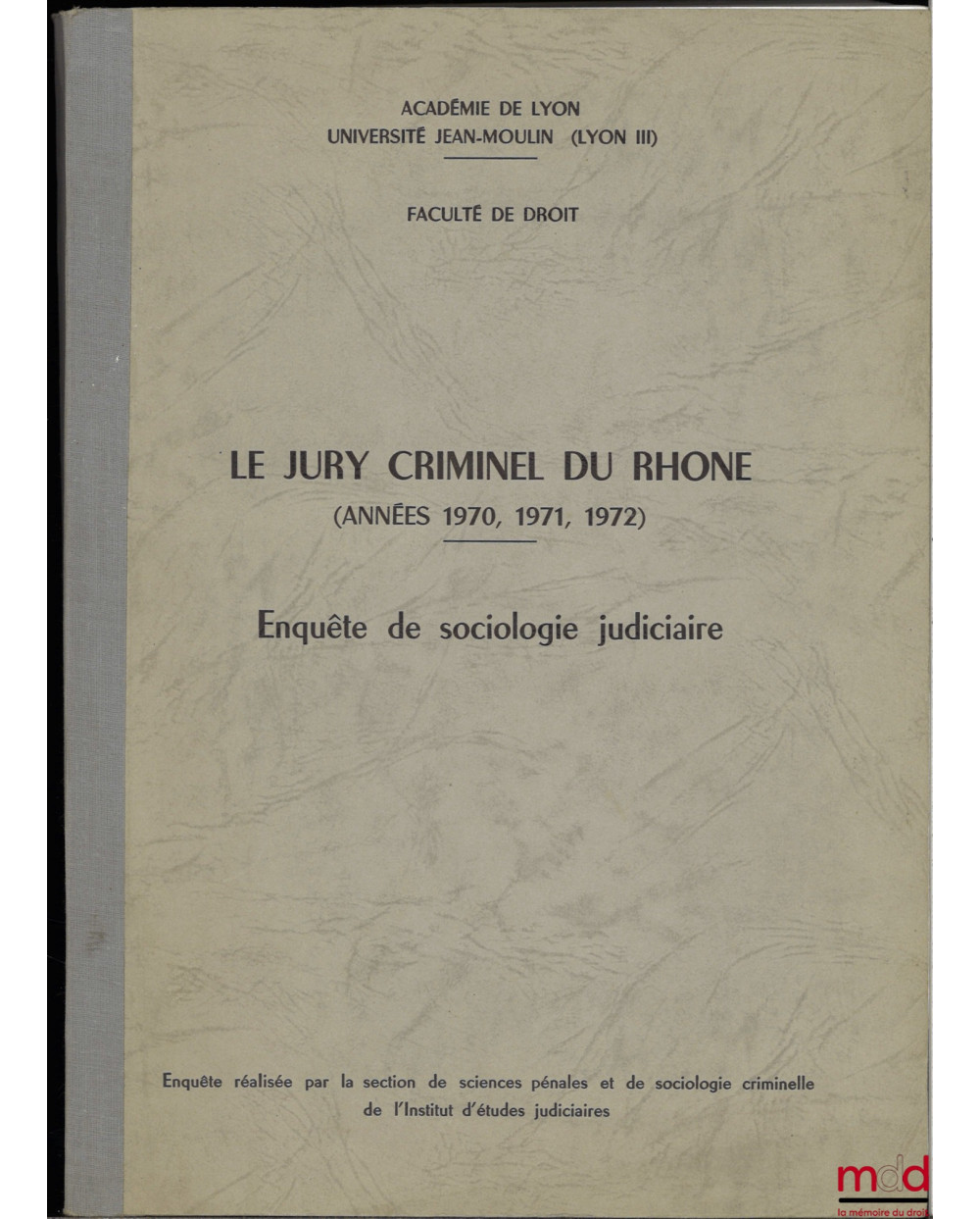 LE JURY CRIMINEL DU RHÔNE (Années 1970, 1971, 1972), Enquête de sociologie judiciaire, Enquête réalisée par la section de sciences pénales et de sociologie criminelle de l’Institut d’études judiciaires sous la direction de André Decocq, Cécile Barberger et Marie Cariou