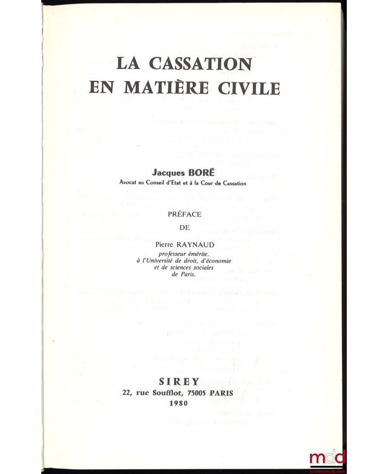LA CASSATION EN MATIÈRE CIVILE, Préface de Pierre Raynaud