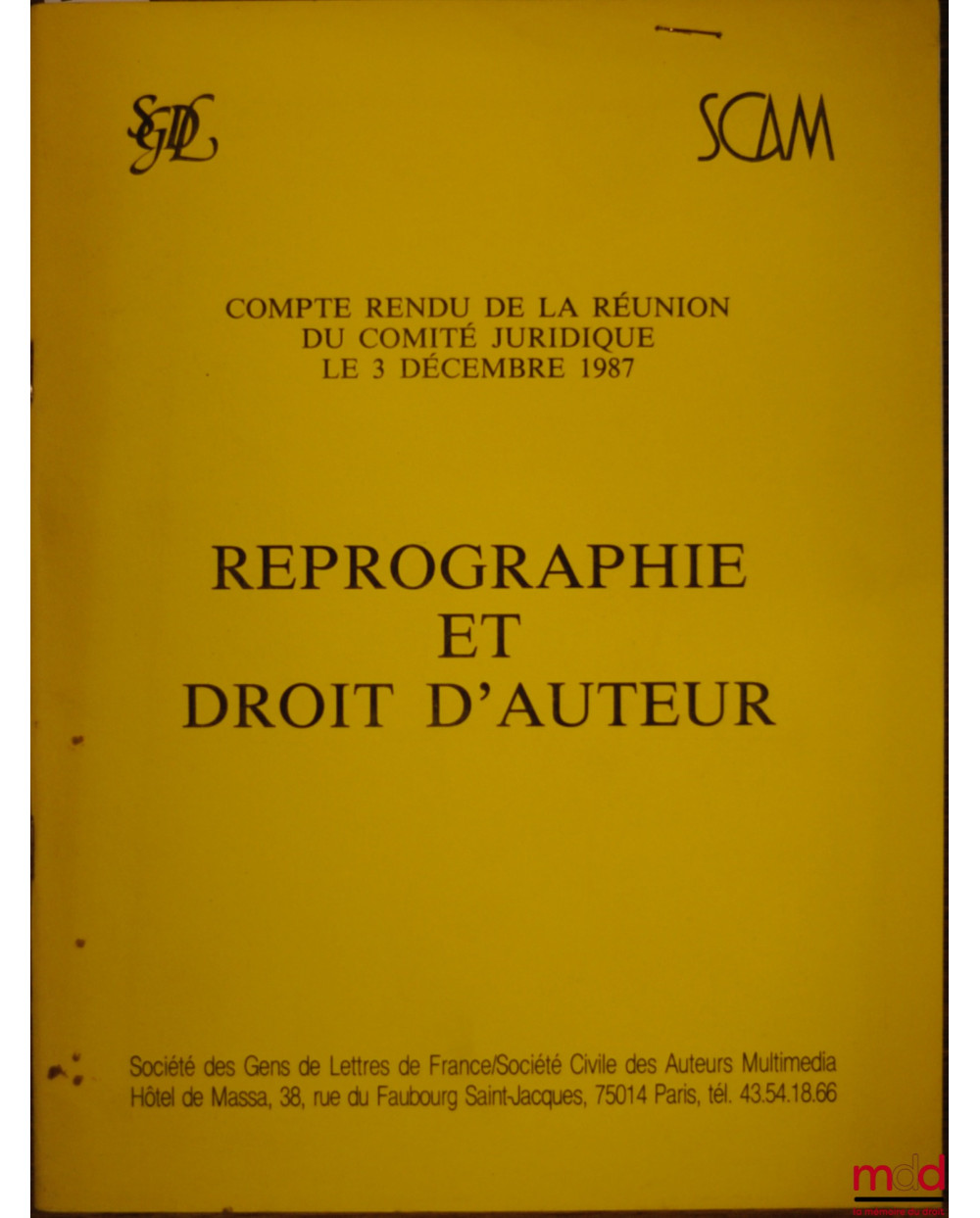REPROGRAPHIE ET DROIT D’AUTEUR, Compte-rendu de la Réunion du Comité juridique de la Société des Gens de Lettres de France (…) du 3 décembre 1987