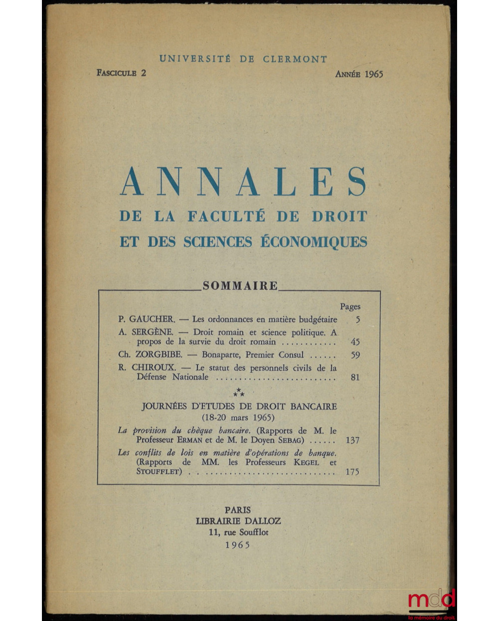 Troisième livraison des Annales de Clermont avec les contributions de P. Gaucher, Les ordonnances en matière budgétaire ; A. Sergène, Droit romain et science politique. À propos de la survie du droit romain ; Ch. Zorgbibe, Bonaparte, Premier Consul ; R. Chiroux, Le statut des personnels civils de la Défense Nationale ; La provision du chèque bancaire (rapports de MM. Erman et Sebag) ; Les conflits de lois en matière d’opération de banque (Rapports de MM. Kegel et Stoufflet).