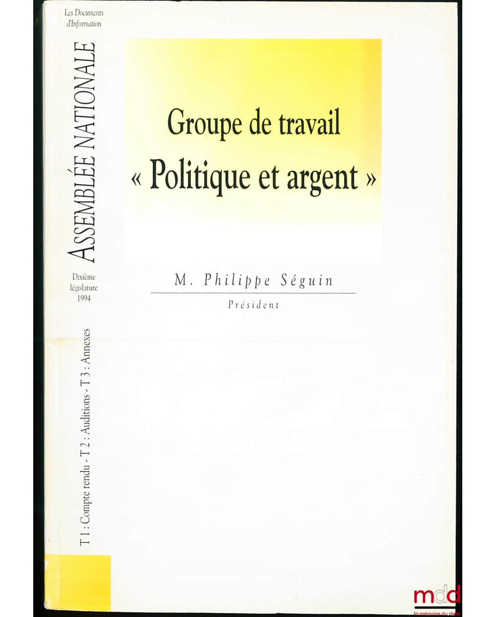 Groupe de Travail : POLITIQUE ET ARGENT, Dixième législature 1994, Président M. Philippe Séguin, 3 t. en 1 vol.