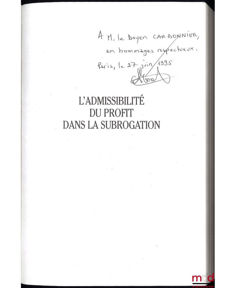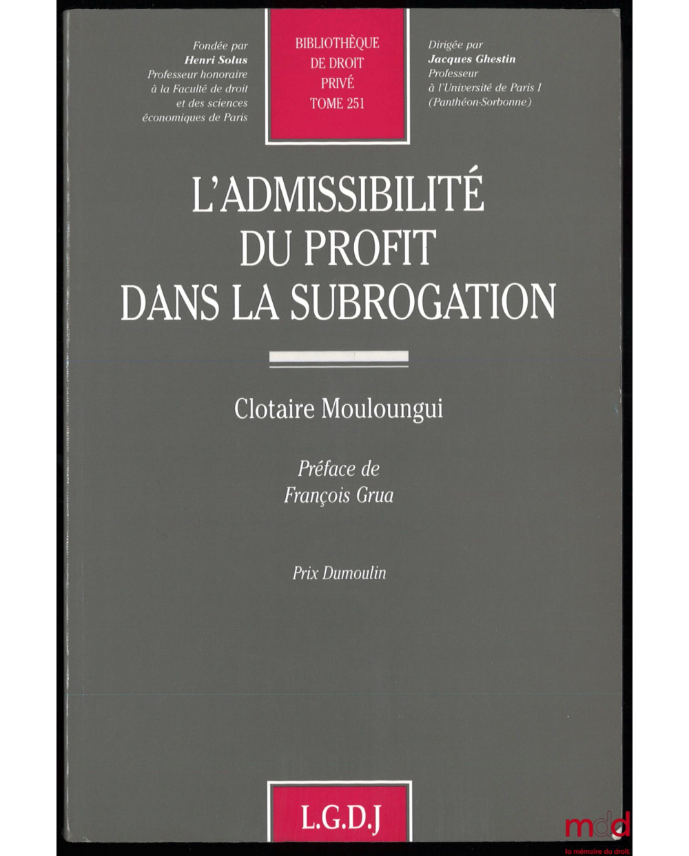 L’ADMISSIBILITÉ DU PROFIT DANS LA SUBROGATION, Bibl. de droit privé, t. 251
