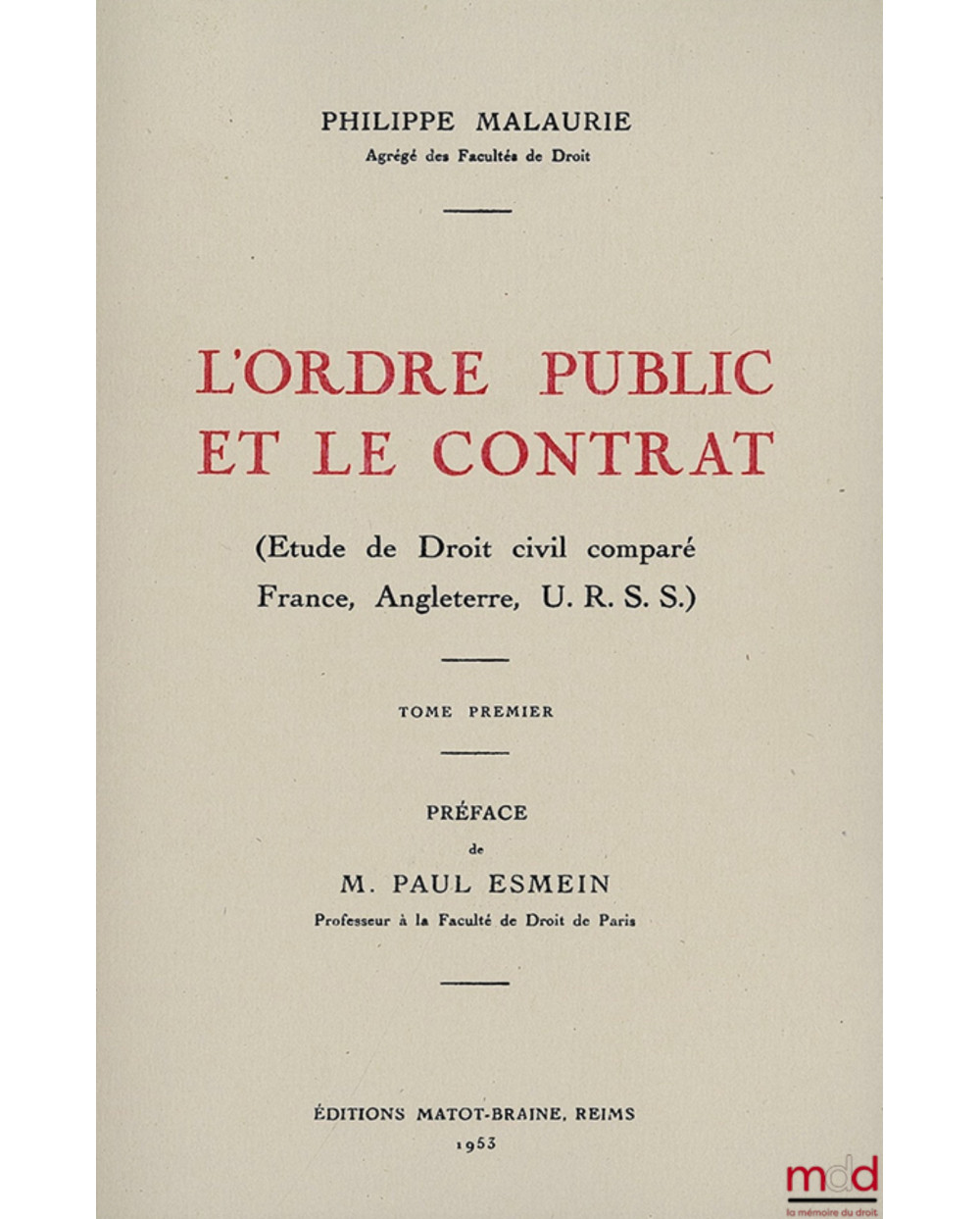 L’ORDRE PUBLIC ET LE CONTRAT (Études de Droit civil comparé France, Angleterre, U.R.S.S.), Préface de Paul Esmein