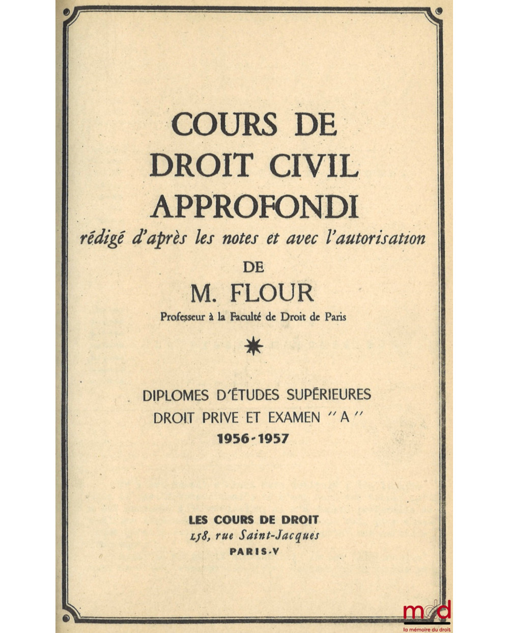 COURS DE DROIT CIVIL APPROFONDI : LE PASSIF SUCCESSORAL, D.E.S. Droit privé et Examen “A”, 1956-1957