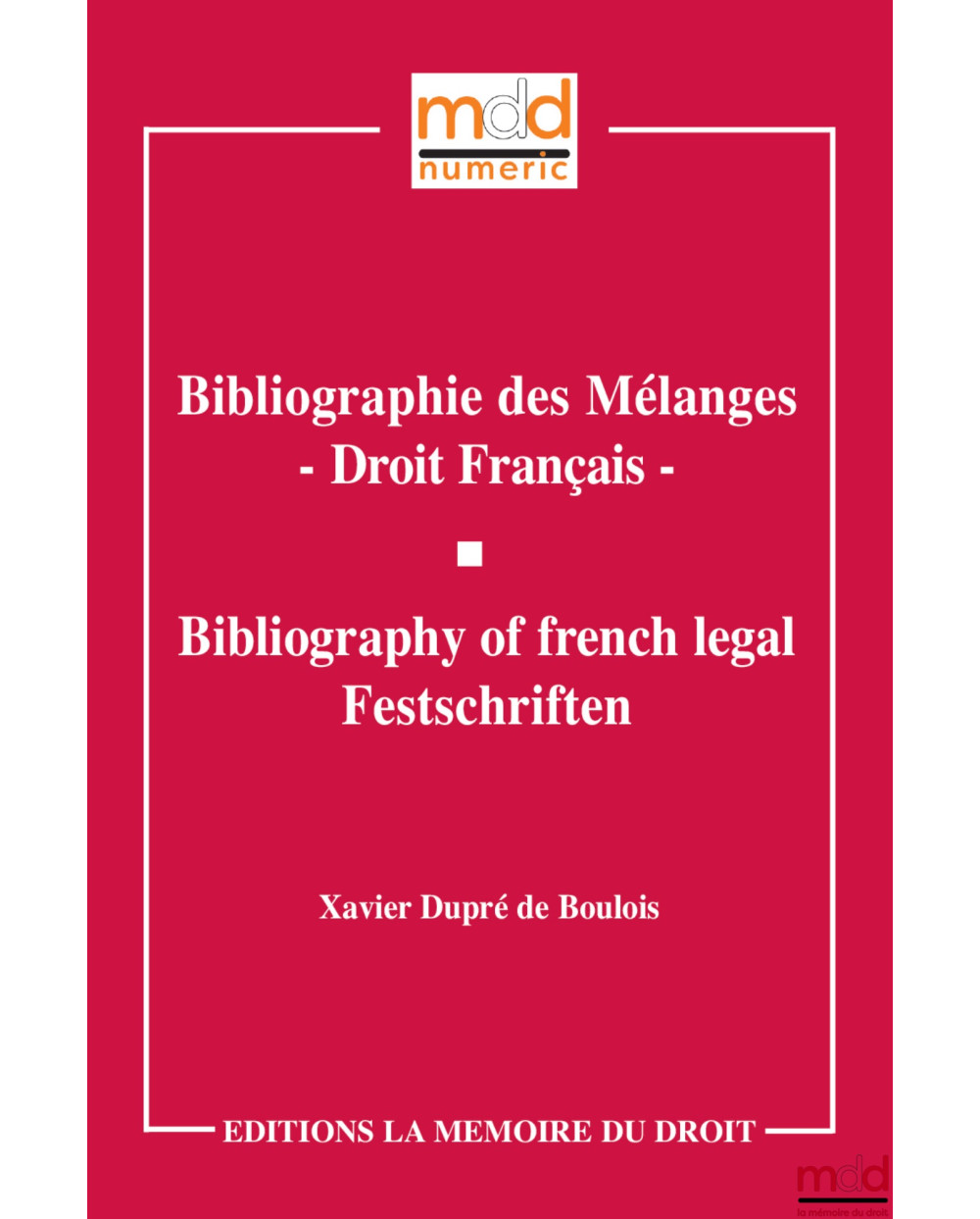 • LIVRE AU FORMAT PDF (eBook) - Il ne s’agit pas d’un livre imprimé • Attendu et espéré depuis longtemps, l’instrument de travail que nous fournit M. Xavier Dupré de Boulois est à bien des égards une étape majeure dans la bibliographie juridique française.Au total, il a été conduit à examiner plus de 1500 volumes, pour en retenir 750 qui contenaient des contributions intéressant le droit français.Ce volume bénéficie d’une conception exemplaire : il est spécialement praticable du fait des précieux index et tables qu’il contient et qui le rendent digne des standards bibliographiques internationaux les plus exigeants.C’est un instrument incontournable pour toute recherche documentaire juridique, indispensable tant aux universitaires qu’aux praticiens.