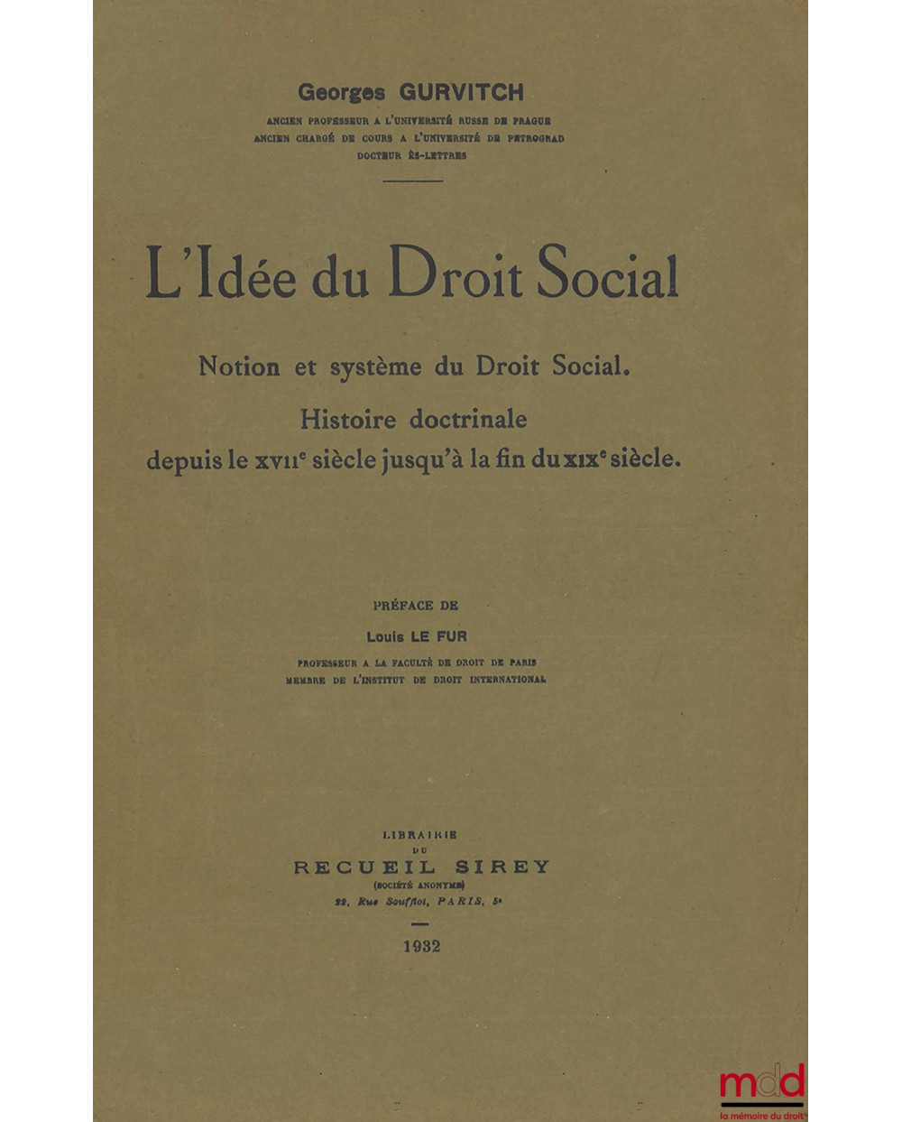 L’IDÉE DU DROIT SOCIAL, Notion et système du Droit Social. Histoire doctrinale depuis le XVIIe siècle jusqu’à la fin du XIXe siècle, Préface de Louis Le Fur
