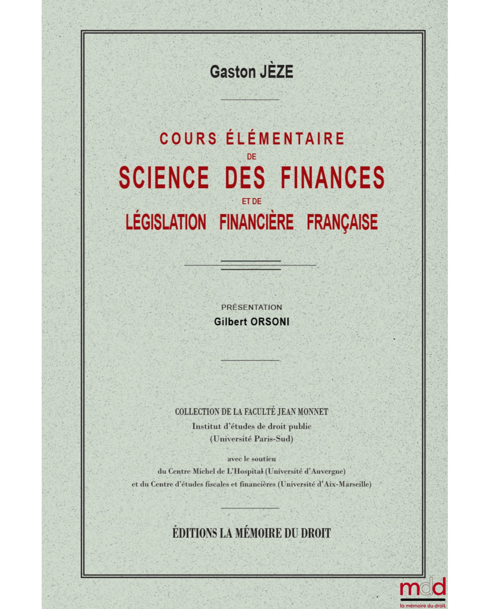 COURS ÉLÉMENTAIRE DE SCIENCE DES FINANCESet de législation financière française, Présentation de Gilbert ORSONI, Collection de la Faculté Jean Monnet