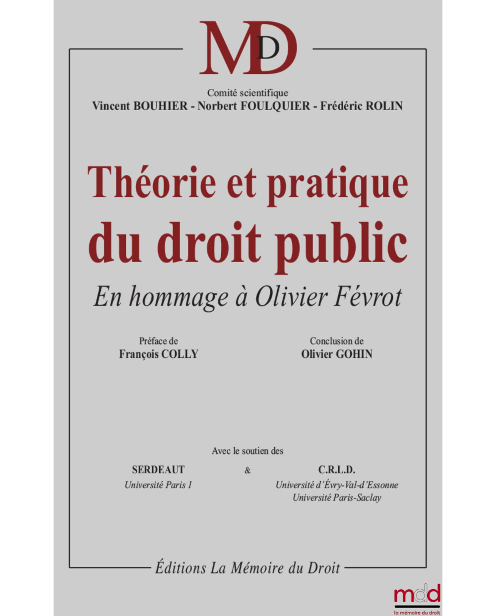 THÉORIE ET PRATIQUE DU DROIT PUBLIC, en hommage à Olivier Févrot, Préface de François Colly, Propos conclusifs de Olivier Gohin, Comité scientifique : Vincent BOUHIER, Norbert FOULQUIER, Frédéric ROLIN, avec le soutien du SERDEAUT (Université Paris I) et du C.R.L.D. (Université d’Évry-Val-d’Essonne et Paris-Saclay)