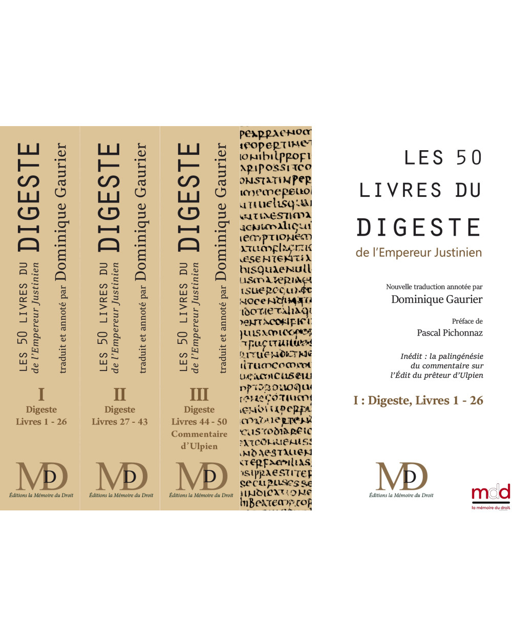 LES CINQUANTE LIVRES DU DIGESTEy compris LA PALINGÉNÉSIE DU COMMENTAIRE SUR L’ÉDIT DU PRÉTEUR D’ULPIEN (d’après Otto Lenel)Volumes 1 à 3Nouvelle traduction française, Édition traduite et annotée sur l’édition de Th. Mommsen (Weidmann, Berlin, 1893) par Dominique GAURIER (Historien du droit, Romaniste - Université de Nantes), Préface de Pascal PICHONNAZ (Professeur de droit privé et de droit romain, Doyen de la Faculté de droit de Fribourg (Suisse))