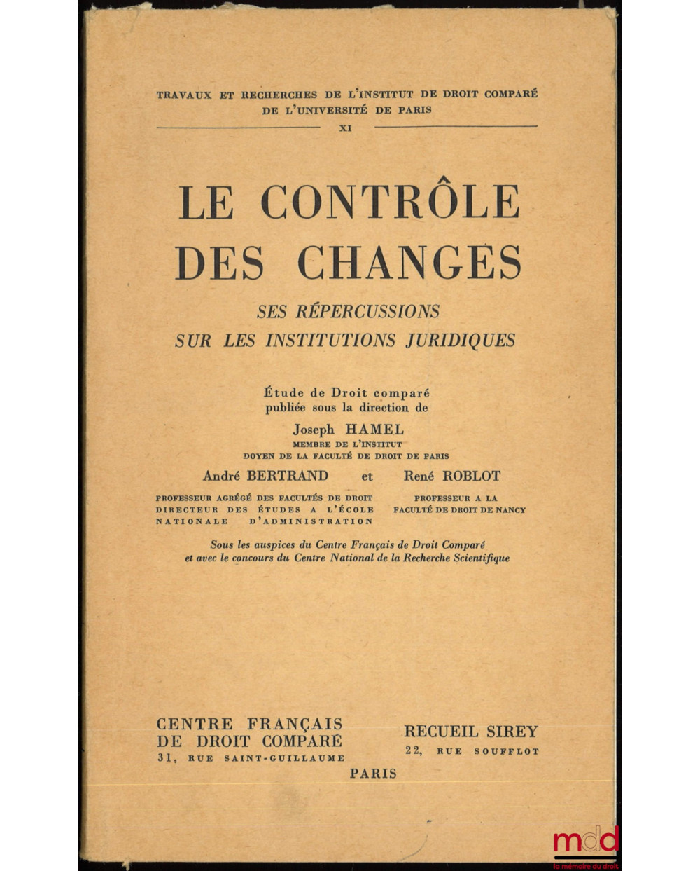 LE CONTRÔLE DES CHANGES. Ses répercussions sur les institutions juridiques, Étude de Droit comparé, Avant-propos de Joseph Hamel, coll. Travaux et Recherches de l’Institut de Droit Comparé de l’Université de Paris, t. XI