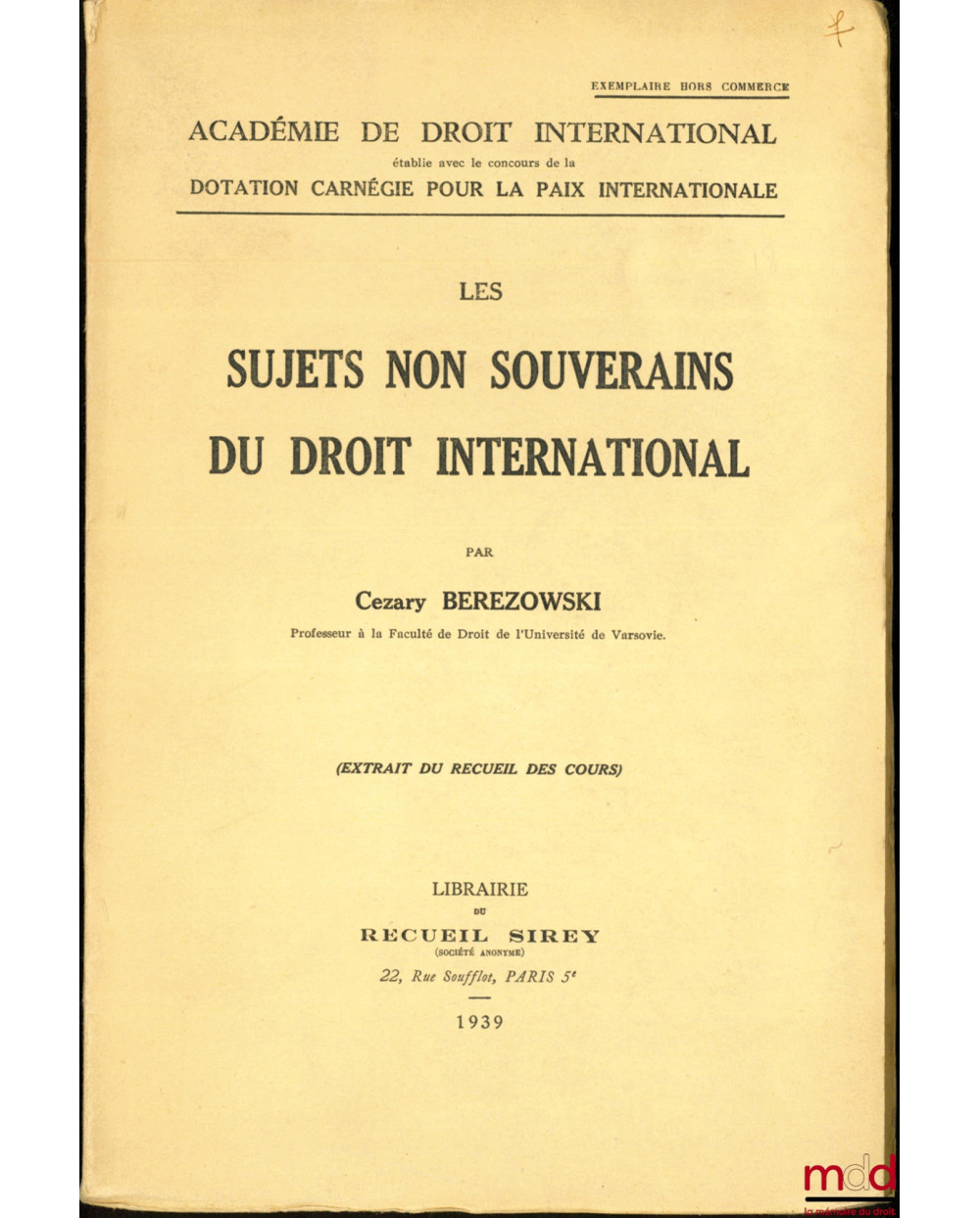 LES SUJETS NON SOUVERAINS DU DROIT INTERNATIONAL, extrait du Recueil des cours, exemplaire hors commerce de l’Académie de droit international