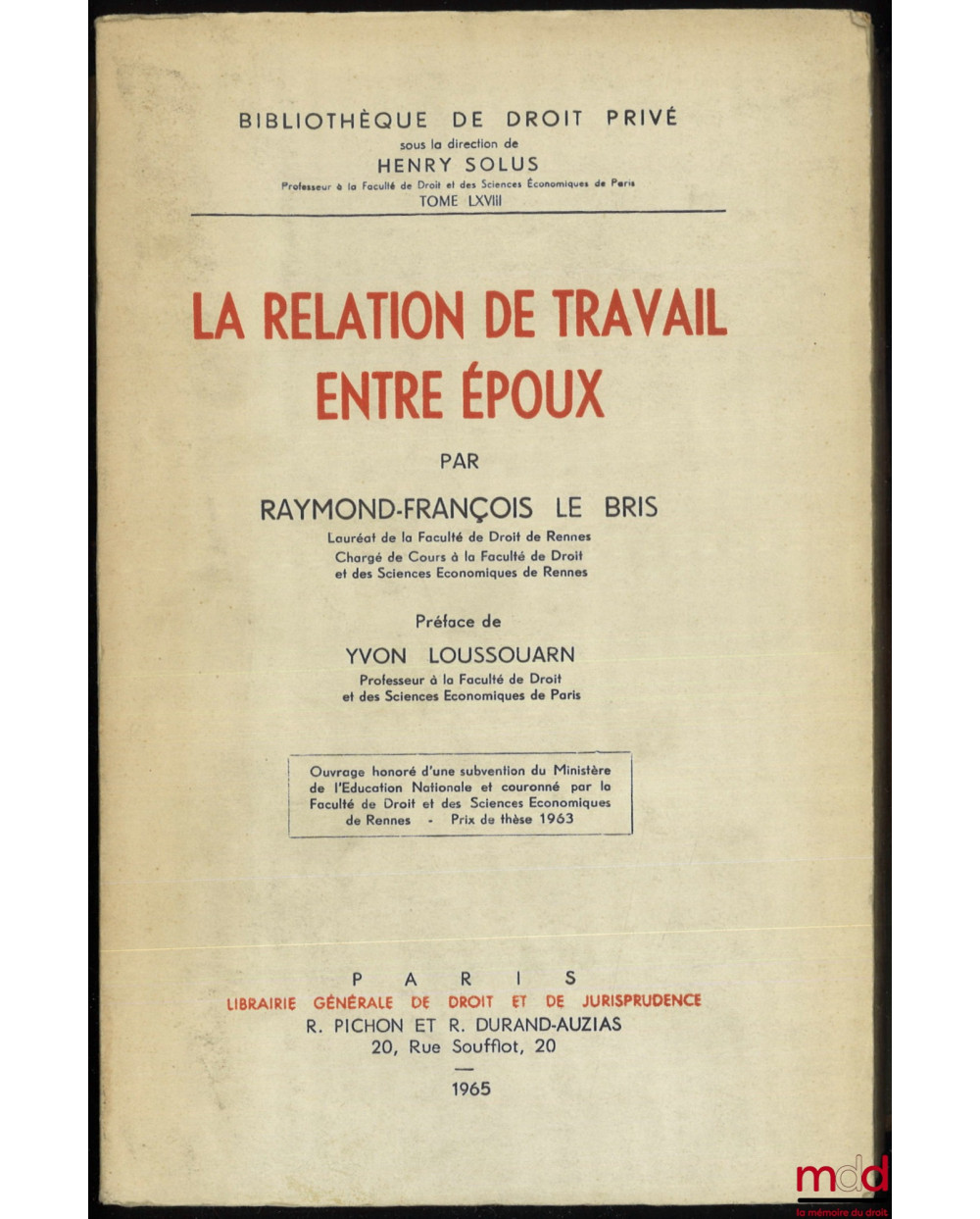 LA RELATION DE TRAVAIL ENTRE ÉPOUX, Préface de Yvon Loussouarn, Bibl. de droit privé, t. LXVIII