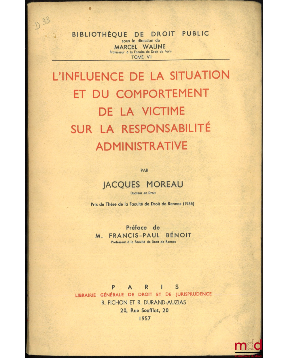 L’INFLUENCE DE LA SITUATION ET DU COMPORTEMENT DE LA VICTIME SUR LA RESPONSABILITÉ ADMINISTRATIVE, Préface de Francis-Paul Bénoit, Bibl. de droit public, t. VII