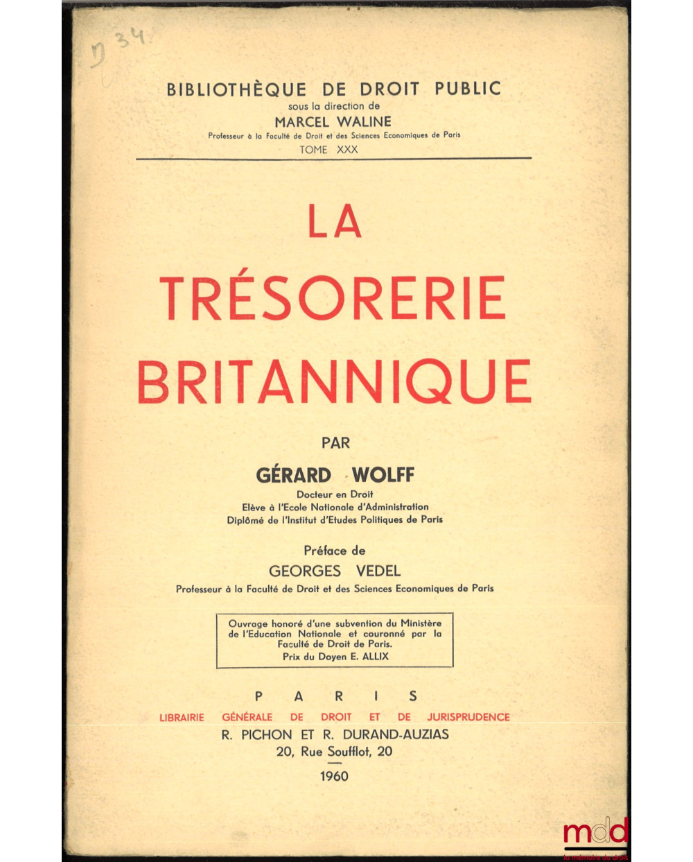 LA TRÉSORERIE BRITANNIQUE, Préface de Georges Vedel, Bibl. de droit public, t. XXX