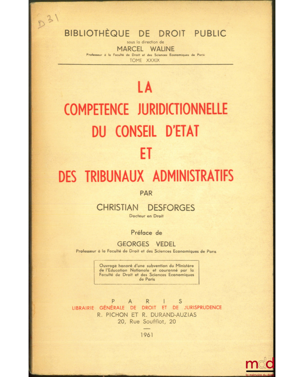 LA COMPÉTENCE JURIDICTIONNELLE DU CONSEIL D’ÉTAT ET DES TRIBUNAUX ADMINISTRATIFS, Préface de Georeges Vedel, Bibl. de droit public, t. XXXIX