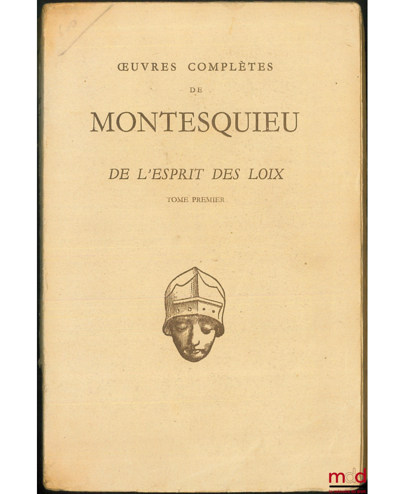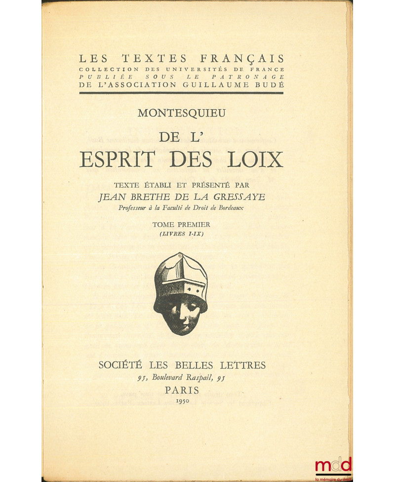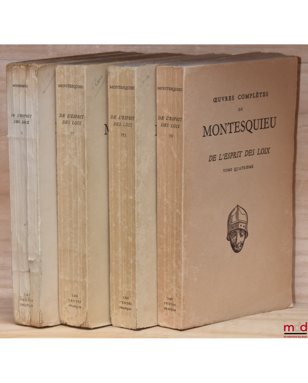 MONTESQUIEU, DE L’ESPRIT DES LOIX. Textes établi et présenté par J. Brethe de la Gressaye, coll. Les textes français :Tome premier : Livres I-IX (1950) ;Tome second : Livres IX-XVIII (1955) ;Tome troisième : Livres XIX-XXVI (1958) ;Tome quatrième : Livres XXVII-XXXI (1961)