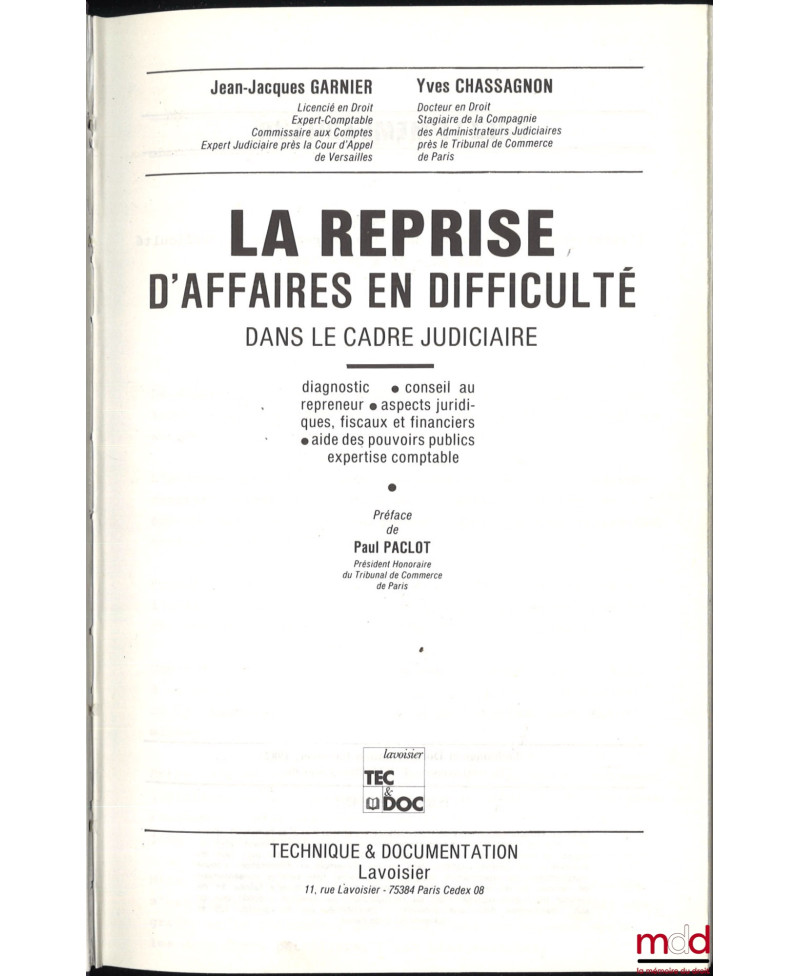 LA REPRISE D’AFFAIRES EN DIFFICULTÉ dans le cadre judiciaire, diagnostic • conseil au repreneur • aspects juridiques, fiscaux et financiers • aide des pouvoirs publics • expertise comptable, Préface de Paul Paclot, coll. Technique & Documentation