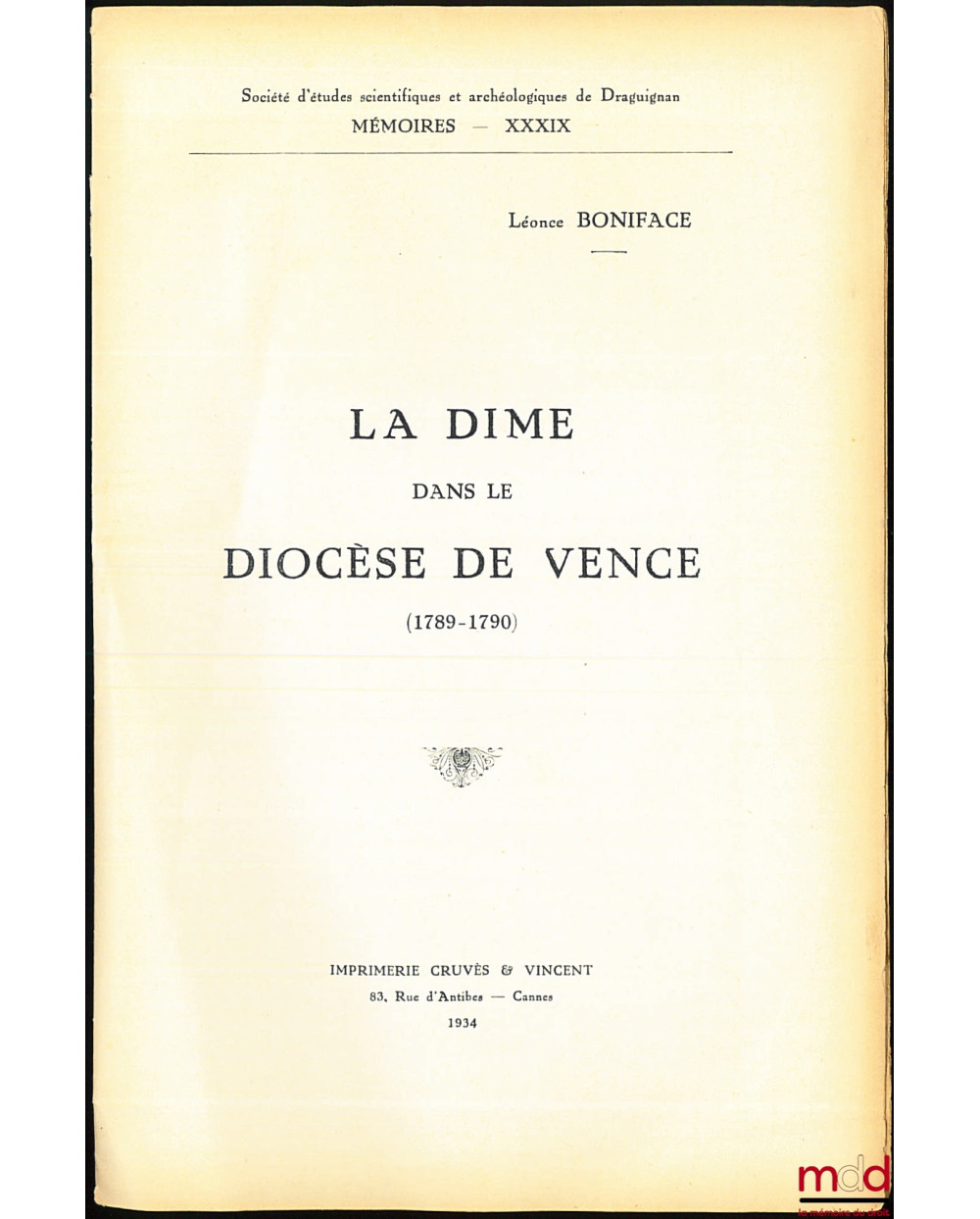 LA DIME DANS LE DIOCÈSE DE VENCE (1789-1790), coll. MÉMOIRES de la société d’études scientifiques et archéologiques de Draguignan