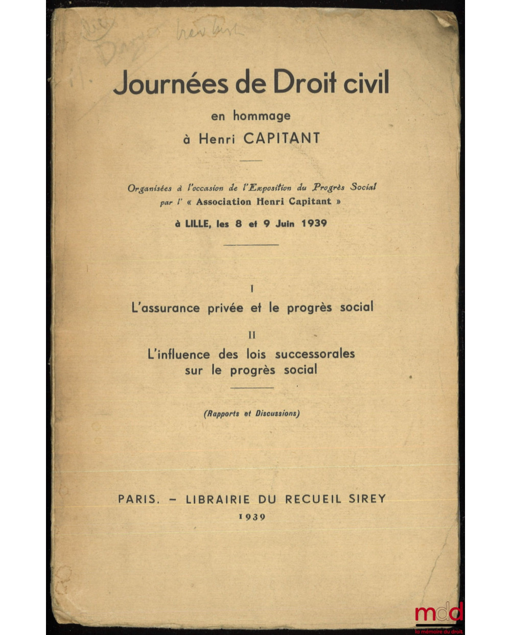 Outre les mélanges Capitant parus la même année, un certain nombre d’hommages furent prononcés à la mémoire de ce grand auteur. Nous avons déjà présenté celui qui avait été fait par l’université de Tokyo le 21 décembre 1937 (cat. MDD n° 15-207). On trouve dans ce recueil quelques textes remarquables : D’abord une discussion sur l’assurance privée et le progrès social entre M. Picard et J. Xavier, puis une un rapport sur l’influence des lois sur le progrès social et des interventions de Maury, Capitant et Hamel. Très rare.