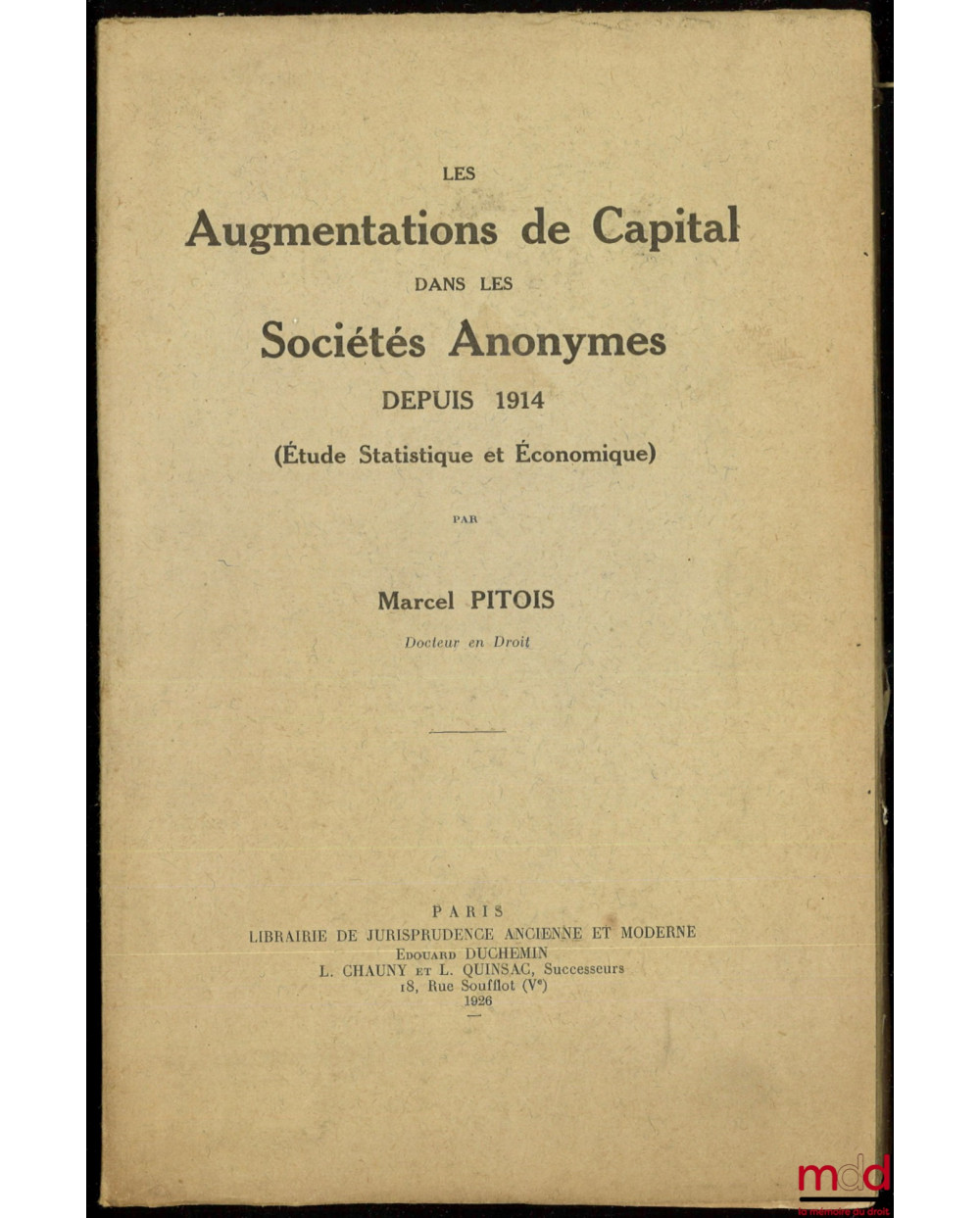 LES AUGMENTATIONS DE CAPITAL DANS LES SOCIÉTÉS ANONYMES DEPUIS 1914 (Étude Statistique et Économique)