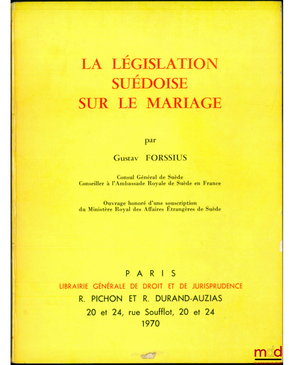 Cet ouvrage « est essentiellement composé de la traduction, extrêmement précise, de la loi du 11 juin 1920 dans la forme et dans la rédaction que lui ont apportées les lois récentes, jusqu’au 1er janvier 1975. On y trouve également les dispositions de la loi de 1920 sur “la mise en exécution de la nouvelle loi sur le mariage” ainsi que les textes de droit international concernant la célébration du mariage, les procès matrimoniaux, la tutelle (loi du 8 juillet 1904 modifiée par une loi du 14 décembre 1973), la reconnaissance de certains divorces ou séparations de corps prononcés à l’étranger (également loi du 14 décembre 1973) et enfin les dispositions de la loi du 1er juin 1912 concernant, toujours du point de vue du droit international privé, certaines questions relatives aux effets juridiques du mariage.Ajoutons que ces textes sont précédés par une excellente préface, brève mais dense, qui les situe avec précision dans leur contexte législatif et dans l’évolution, depuis cinquante ans, de la politique juridique de la Suède. » (Marc Ancel, RIDC n° 1/1976, p. 183).