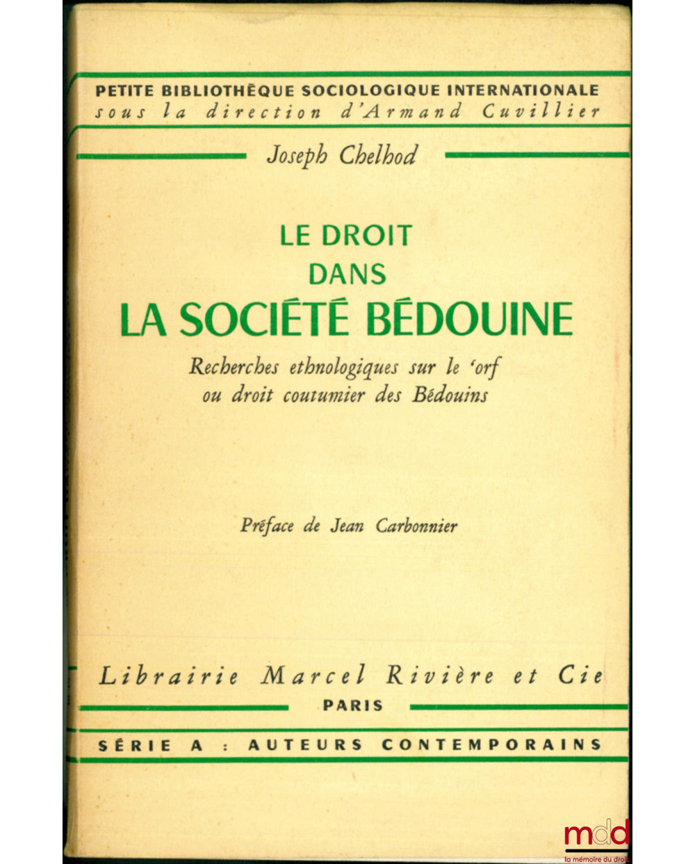 LE DROIT DANS LA SOCIÉTÉ BÉDOUINE, Recherches ethnologiques sur le ‘orf ou droit coutumier des Bédouins, Préface de Jean Carbonnier, Petite bibliothèque sociologique internationale