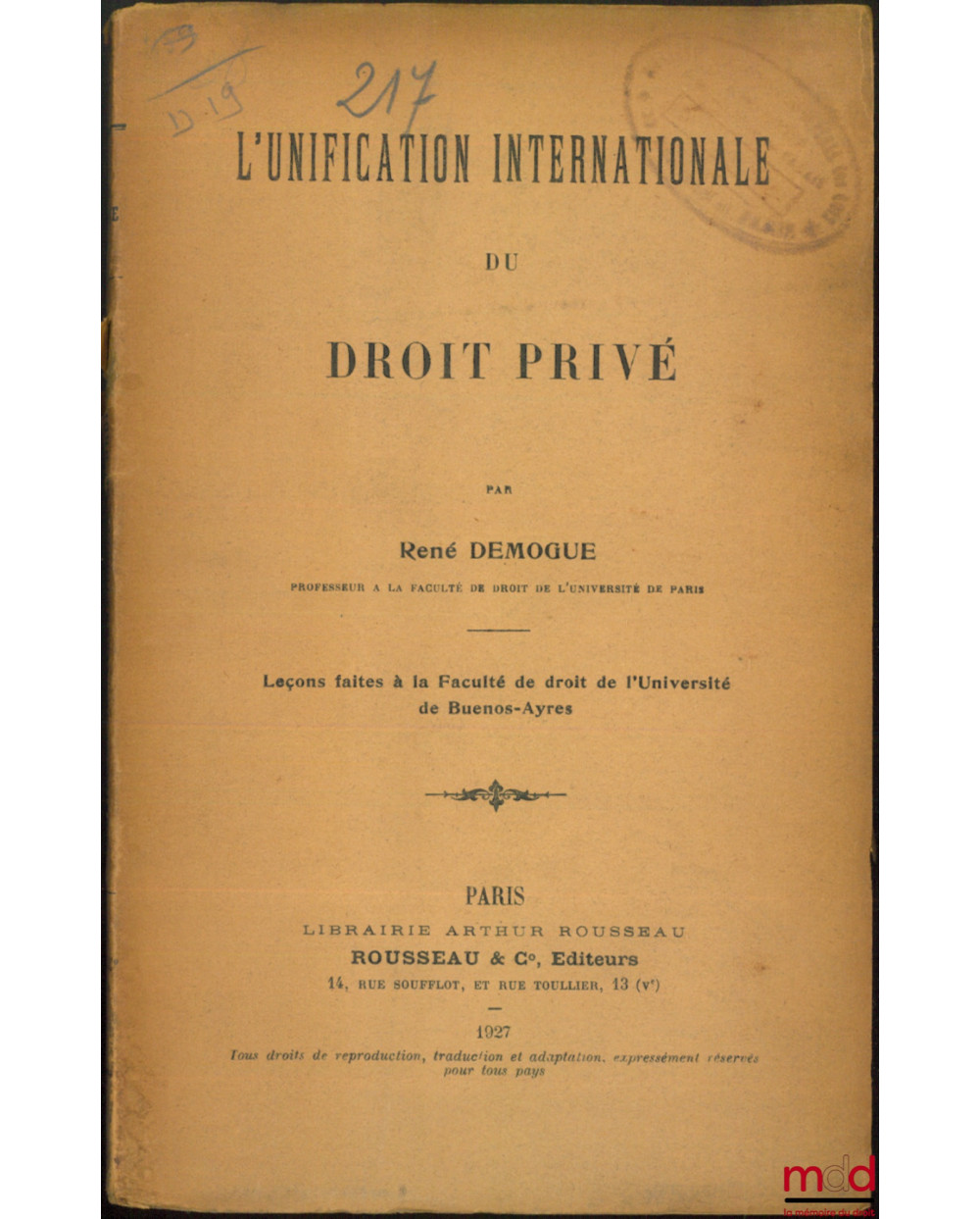 L’UNIFICATION INTERNATIONALE DU DROIT PRIVÉ, Leçons faites à la Faculté de droit de l’Université de Buenos-Ayres