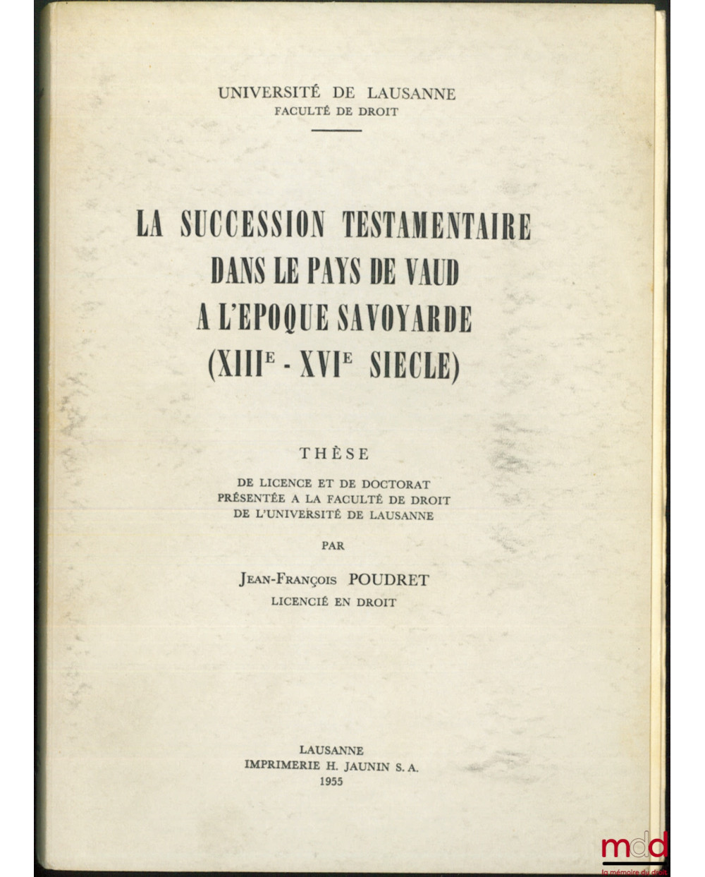 LA SUCCESSION TESTAMENTAIRE DANS LE PAYS DE VAUD À L’ÉPOQUE SAVOYARDE (XIIIe-XVIe SIÈCLE), Thèse de Licence et Doctorat, Université de Lausanne